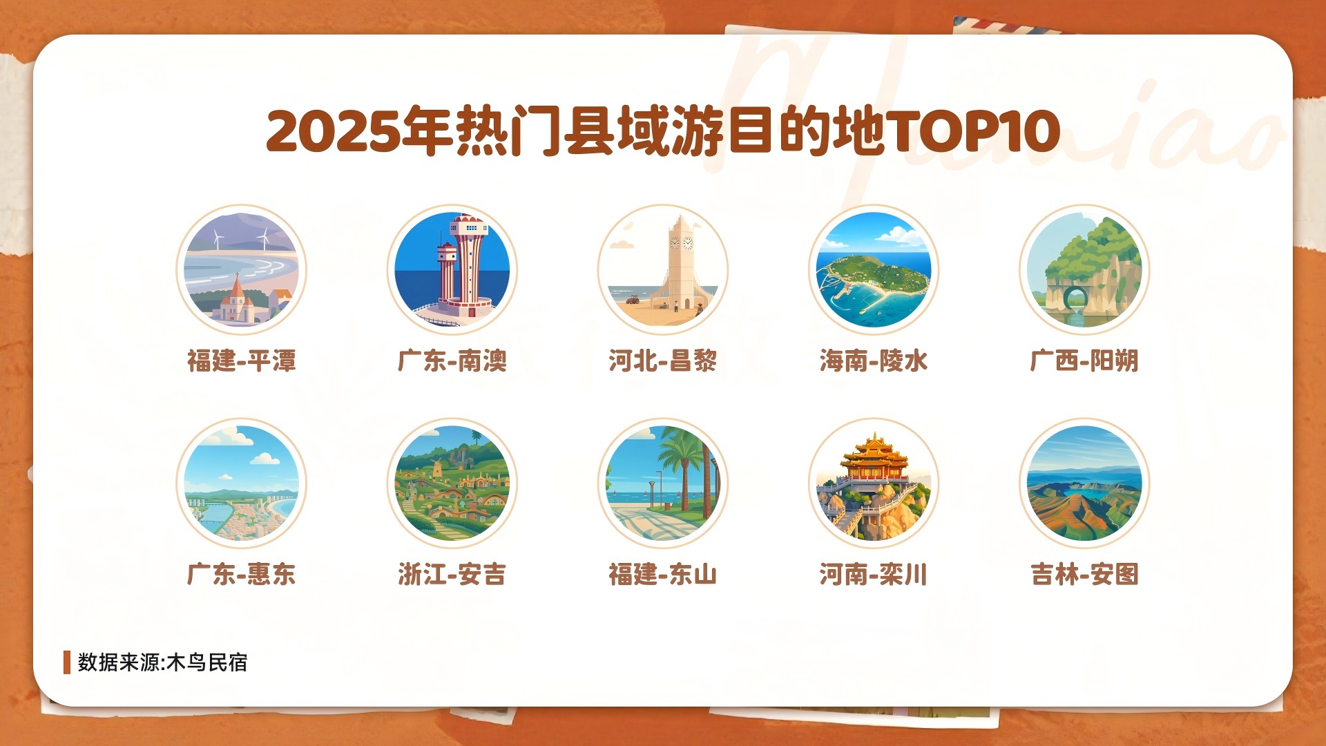 周末游需求进一步推动了“奔县游”,00后成为县域旅游主力,他们追求“小众”与“松弛”,平潭县、南澳县、昌黎县、陵水黎族自治县、阳朔县、惠东县、安吉县、东山县、栾川县、安图县成为2025年县域目的地TOP10,县域民宿订单同比增长36%,奔县游带动更多县城出圈。
