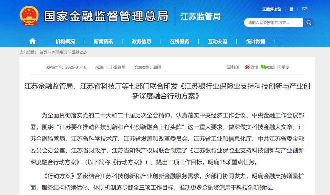 记者从江苏金融监管局获悉,近日,江苏金融监管局、江苏省科学技术厅、江苏省发展和改革委员会、江苏省工业和信息化厅、中共江苏省委金融委员会办公室、江苏省财政厅、江苏省知识产权局联合制定了《江苏银行业保险业支持科技创新与产业创新深度融合行动方案》(简称《行动方案》)。