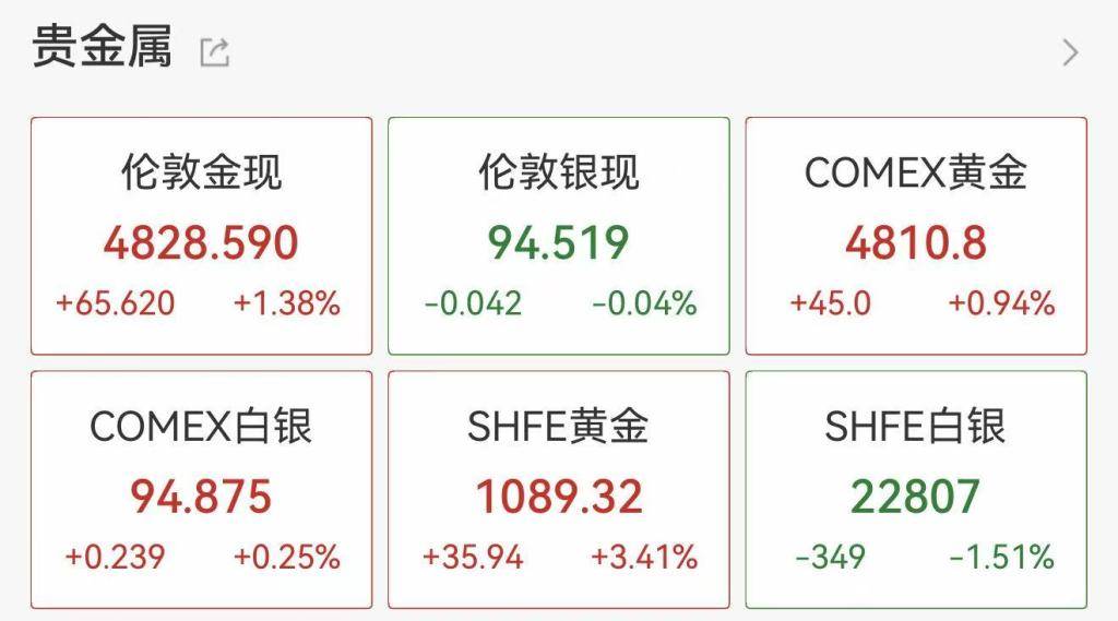 截至发稿时,现货黄金(伦敦金现)报4828.59美元/盎司,涨1.38%。