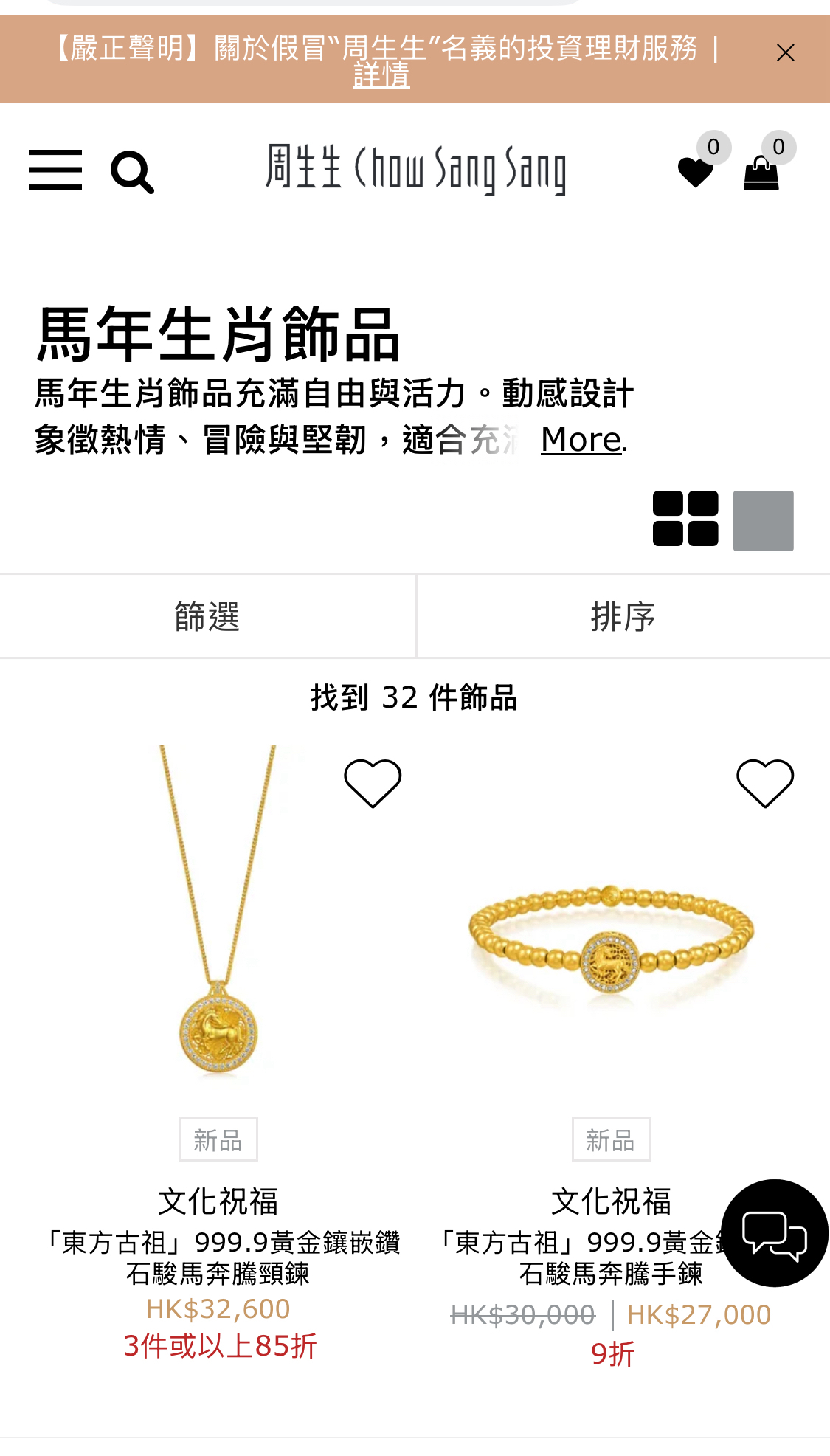 周生生官网马年生肖饰品网上展示了32种品种的商品。