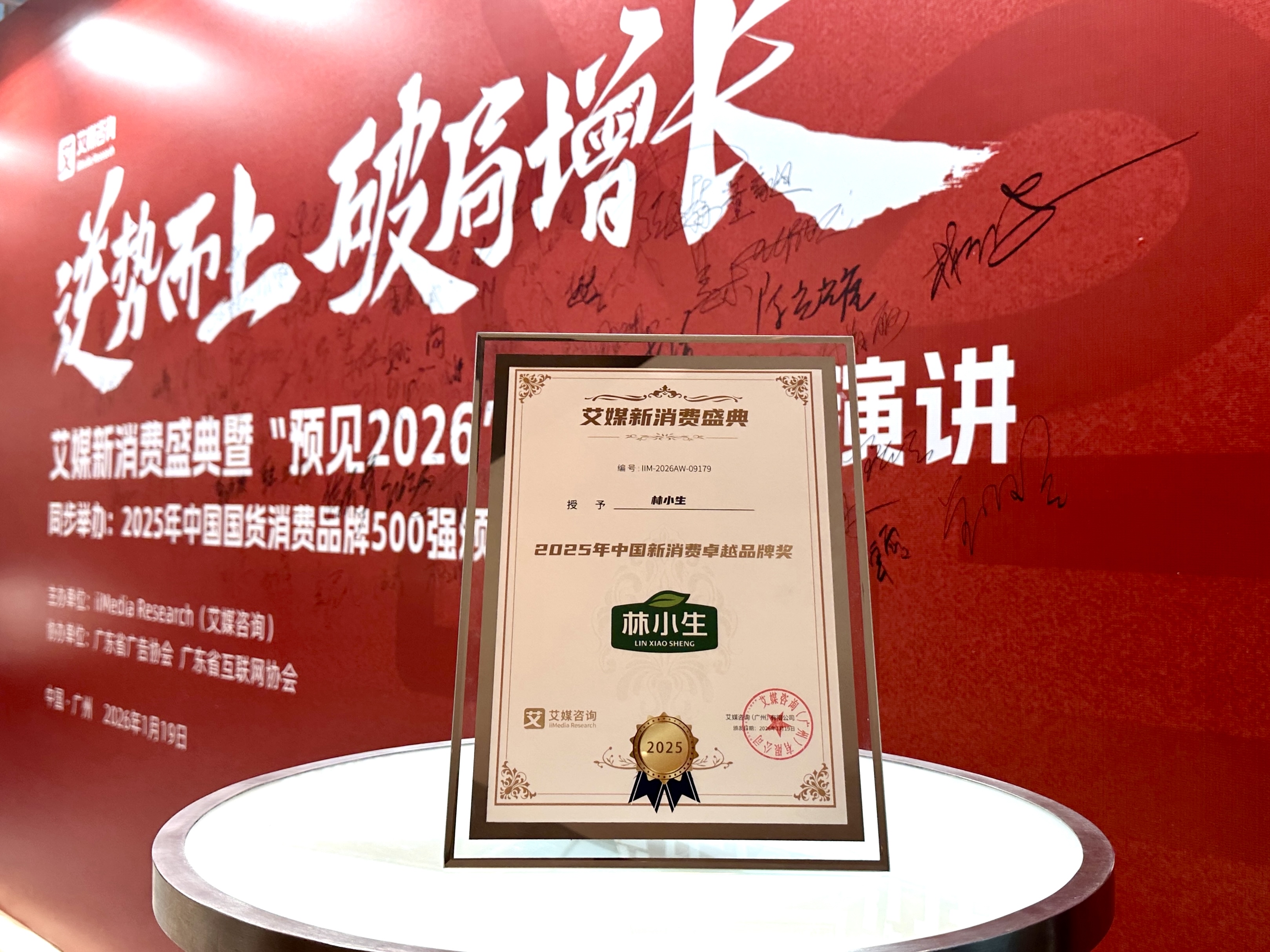 2026年1月19日,新经济产业智库艾媒咨询主办的艾媒新消费盛典在广州举行。本次艾媒新消费盛典以“逆势而上,破局增长”为主题。会上提到,当下消费市场的底层逻辑已从过往单纯的功能满足升级为与消费者的深度情感共鸣,“更健康、更文化、更智能”成为核心趋势。其中,“更健康”意味着健康需求重塑消费决策,锚定健康生活方式赛道成为品牌破局关键。现场揭晓了2025年中国国货消费品牌500强等系列品牌榜单。健康食品品牌林小生凭借产品创新和高增速表现,荣获“2025年中国新消费卓越品牌奖”。共同获奖的还有糕点品牌稻香村、个护品牌曼秀雷敦、智能家居品牌云鲸等。