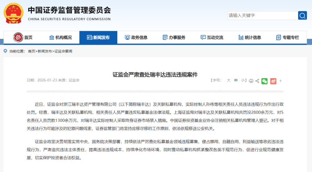 近日,证监会对浙江瑞丰达资产管理有限公司(以下简称瑞丰达)及关联私募机构、实际控制人孙伟等相关责任人员违法违规行为作出行政处罚。经查,瑞丰达及关联私募机构、相关责任人员严重违反私募基金法律法规。上海证监局对瑞丰达及关联私募机构共罚没2800余万元,对5名责任人员罚款1300余万元,对瑞丰达实际控制人采取终身证券市场禁入措施。中国证券投资基金业协会注销相关私募机构管理人登记。对于相关违法行为可能涉及的犯罪问题线索,证券监管部门将坚持应移尽移的工作原则,依法依规移送公安机关。