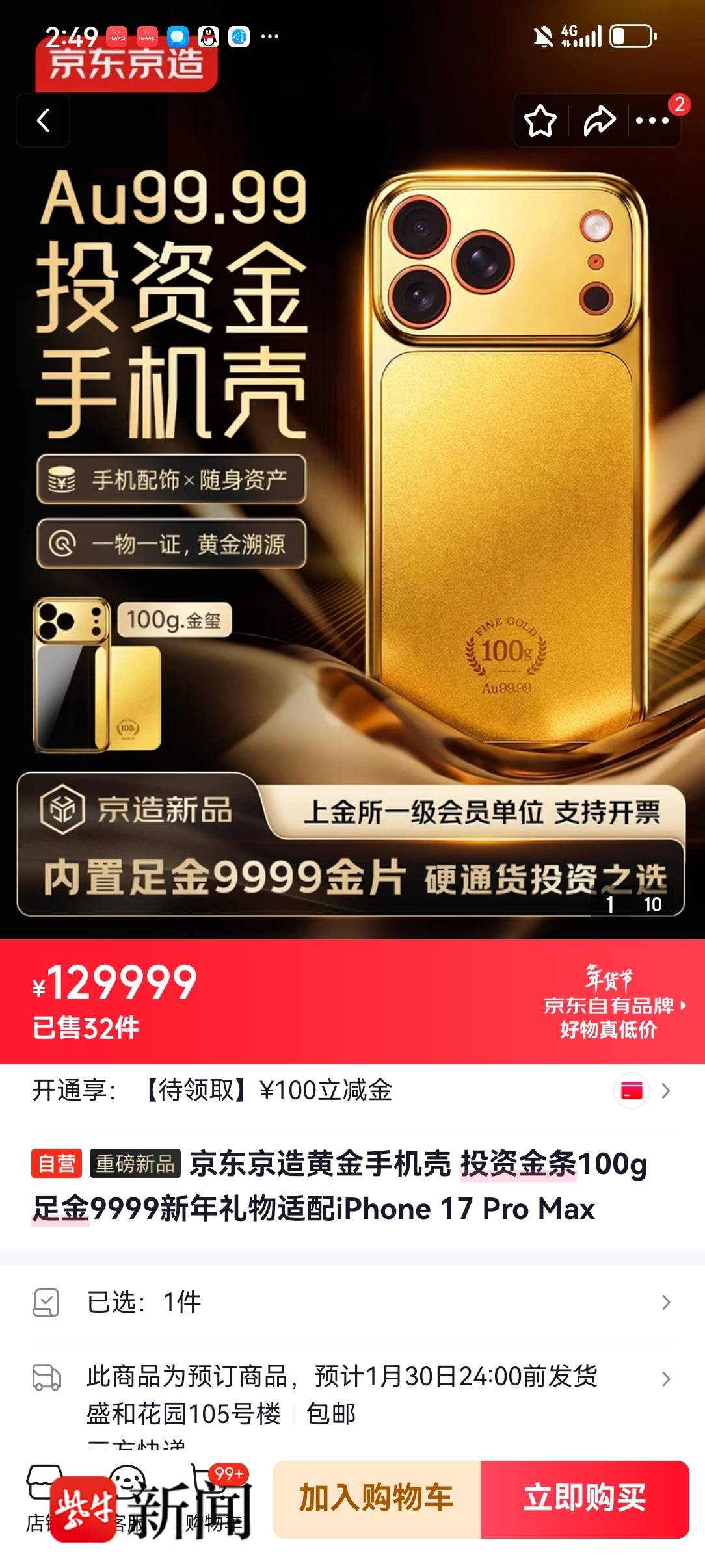 近日,京东平台正式推出黄金手机壳,内置足金 9999 金片,最低12999元起,最高达129999元。扬子晚报/紫牛新闻记者在京东平台看到,该黄金手机壳按黄金克重价格分5个档位,仅适配iPhone 17 Pro Max,目前已经售出数百件,有多位买家晒出带图评价。记者还发现,1 月 23 日所有款的价格比前一日又上涨了,最便宜的10g款已缺货。这款黄金手机壳值得买吗?记者请教了专家。
