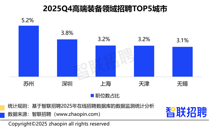 高端装备领域的人才需求主要在长三角和珠三角集聚。其中,苏州(5.2%)位列全国第一,深圳(3.8%)、上海(3.2%)、天津(3.2%)、无锡(3.1%)紧随其后。