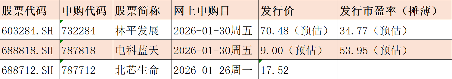 据同花顺iFinD,下周(1月26日-1月30日)将有3只新股申购,其中沪市主板有1只,科创板2只,合计发行约2.5亿股,预计合计募资39.43亿元。具体来看,1月26日周一发行的是北芯生命;1月30日周五发行的是林平发展、电科蓝天。