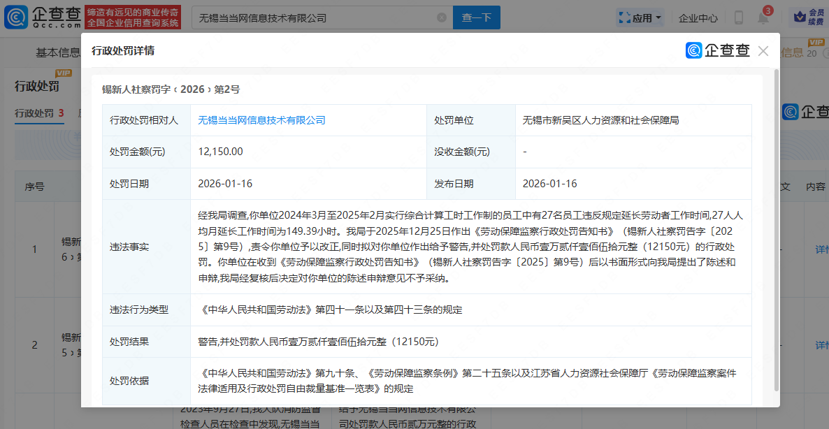 扬子晚报网1月26日讯(记者 徐兢)1月26日,记者从企查查获悉,企查查APP显示,近日,无锡当当网信息技术有限公司违反劳动法被罚12150元。