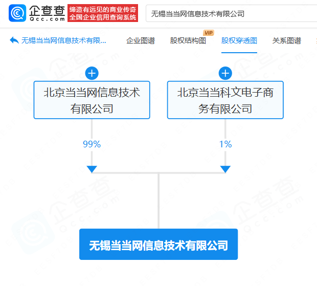 企查查股权穿透显示,无锡当当网信息技术公司由北京当当网信息技术有限公司、北京当当科文电子商务有限公司共同持股。