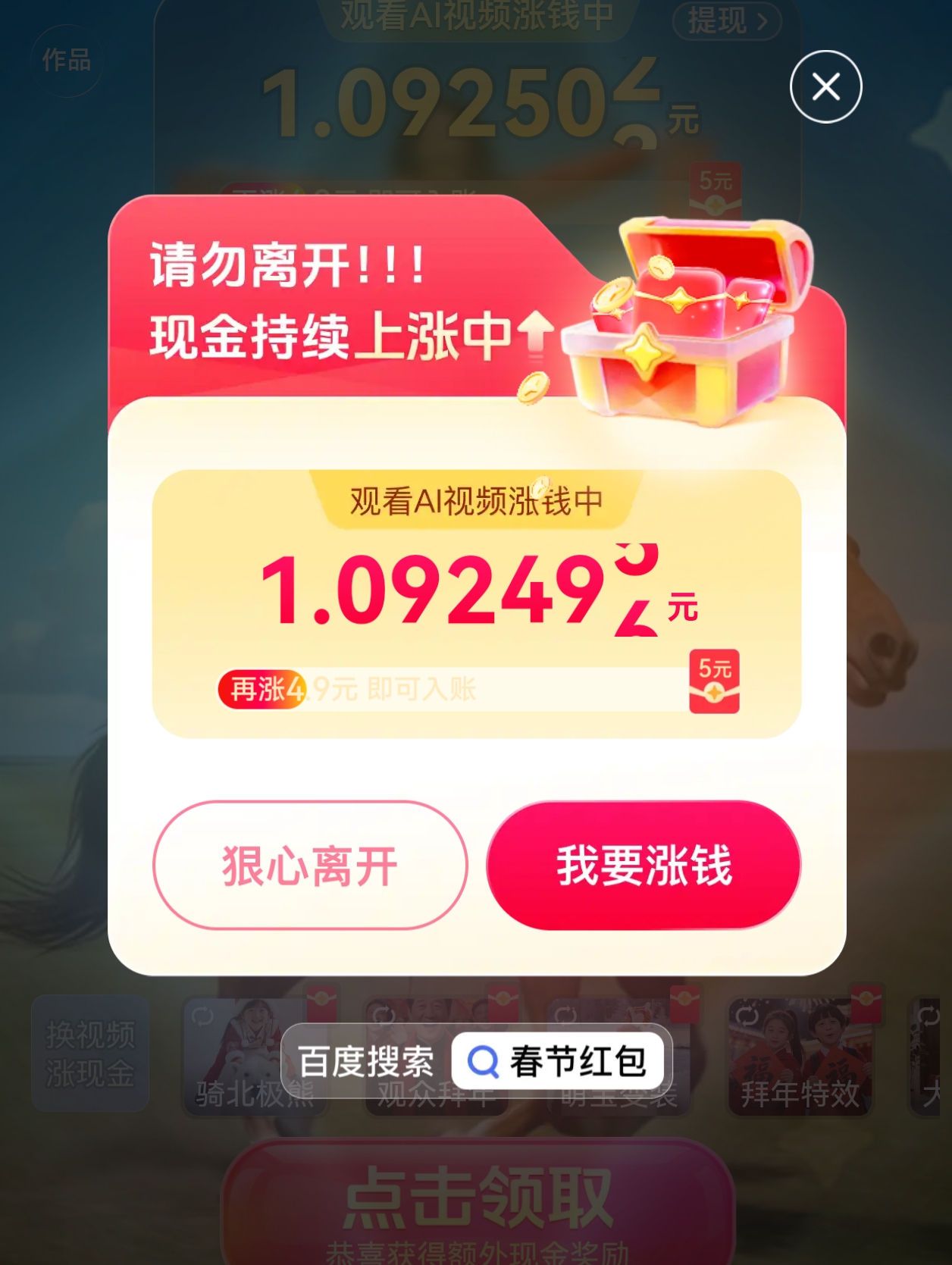 1月26日,记者下载百度APP,搜索“春节红包”进入页面,随即便进入看视频“涨钱”的环节,是一段美女策马奔腾的AI视频,点击一次按钮涨幅几分钱。最后页面跳转去“文心助手”,提示定制专属祝福语最高可以领取2元奖励。操作约5分钟,页面提醒记者,红包有1.09元。