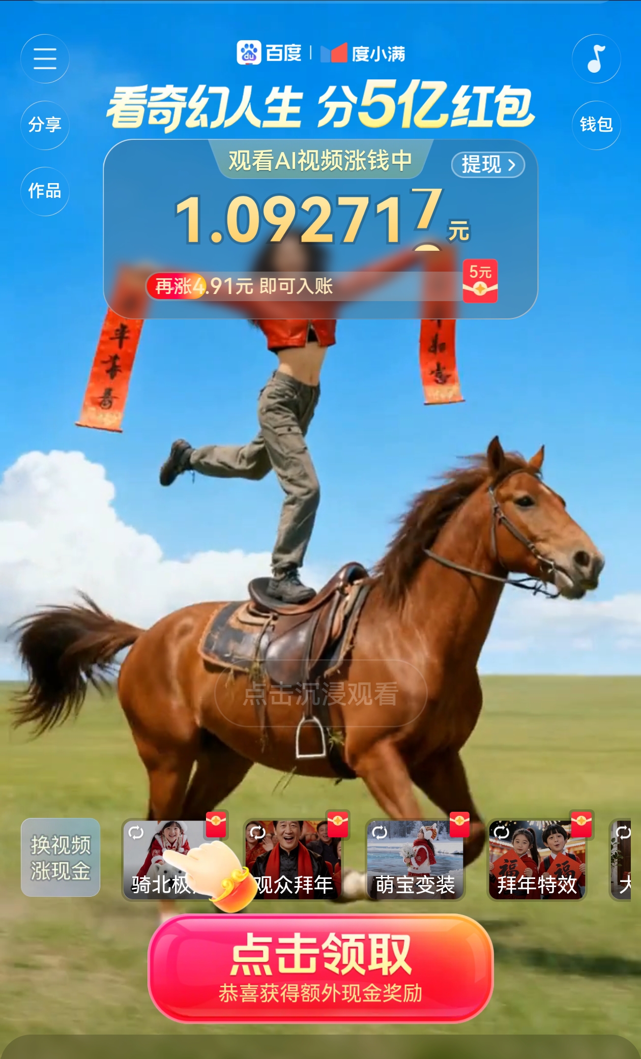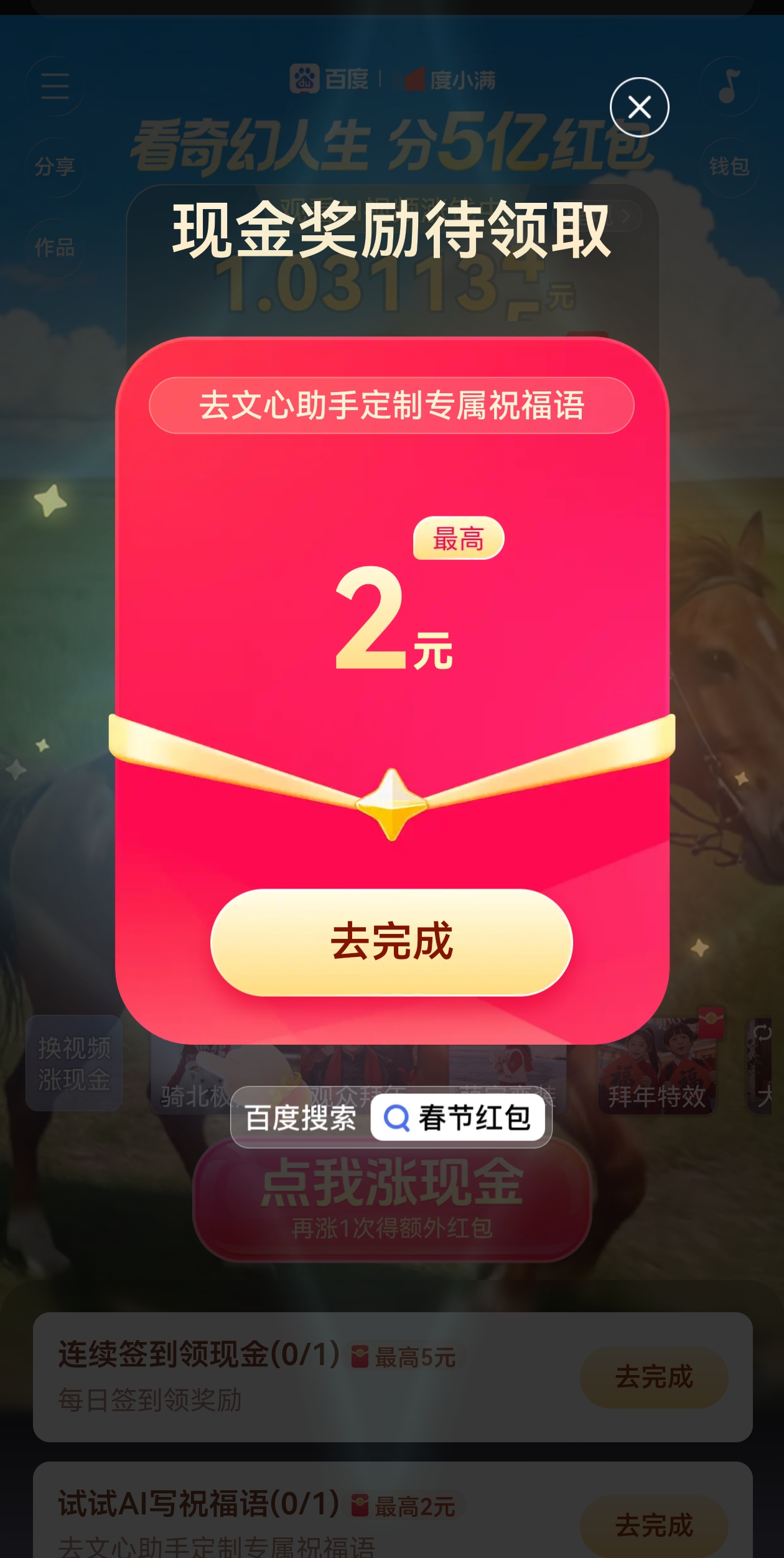 而百度的红包活动周期则从1月26日持续至3月12日,同时联动北京广播电视台春晚。其主要有三种核心玩法。一是看视频领钱:用户在百度APP搜索“春节红包”进入“奇幻人生”主题会场,可体验近200款AI特效玩法;部分AI特效内置互动剧情,用户点击不同剧情选项,可解锁故事分支,并同步获得现金红包。