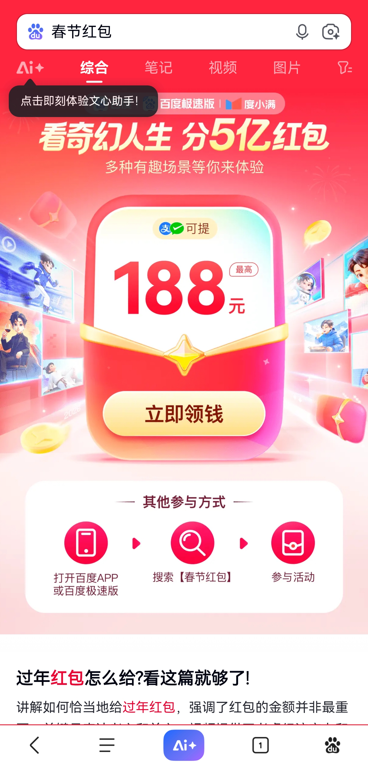 三是则是通过文心助手猜口令。百度在小红书官方账号“@百度搜索”将每日发布“马图线索”,用户通过图片内容联想对应的口令词,并在百度APP首页点击底部“AI”图标进入文心助手,输入猜中的口令词,即可触发隐藏红包彩蛋。