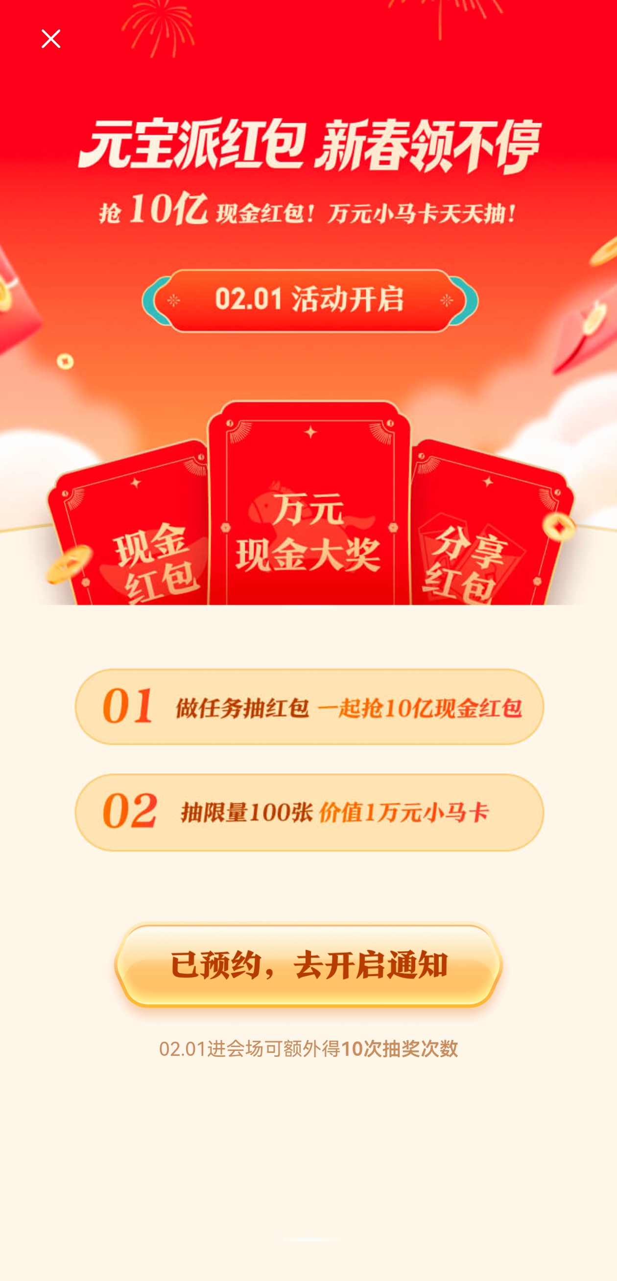 1月26日,记者下载元宝APP,页面跳出预约卡片,点击进入后看到“抢10亿现金红包”,点预约后页面提示“预约成功”、“2月1日活动开启当天,额外获得10次抽奖次数”。据腾讯介绍,红包金额可以从元宝直接提现到微信。