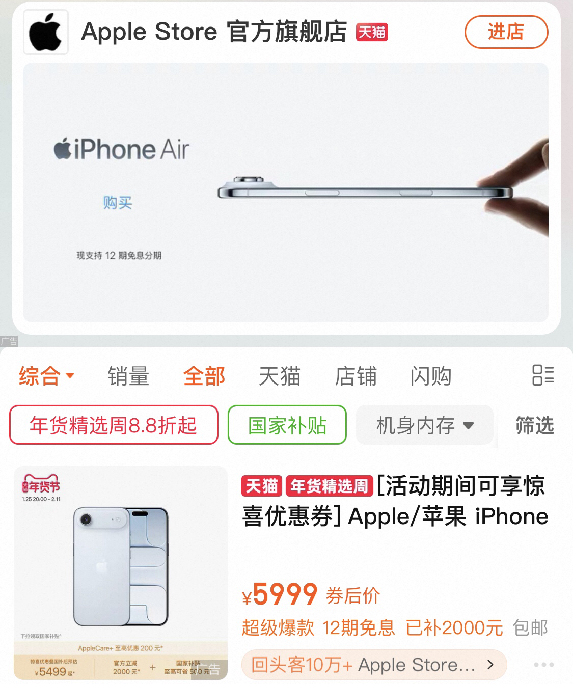 1月25日晚,苹果天猫旗舰店的一纸新年促销公告,苹果天猫旗舰店显示,2026年1月25日20:00起至2月11日23:59:59止,苹果将开启2026年天猫年货狂欢季。其中,原价7999元的256G的iPhone Air,官方立减2000元,叠加国补到手价5499元起。这款三个月前刚刚上市的新机,创下了苹果新iPhone上市后的最大降幅纪录,折射出苹果在中国高端市场面临的结构性挑战。