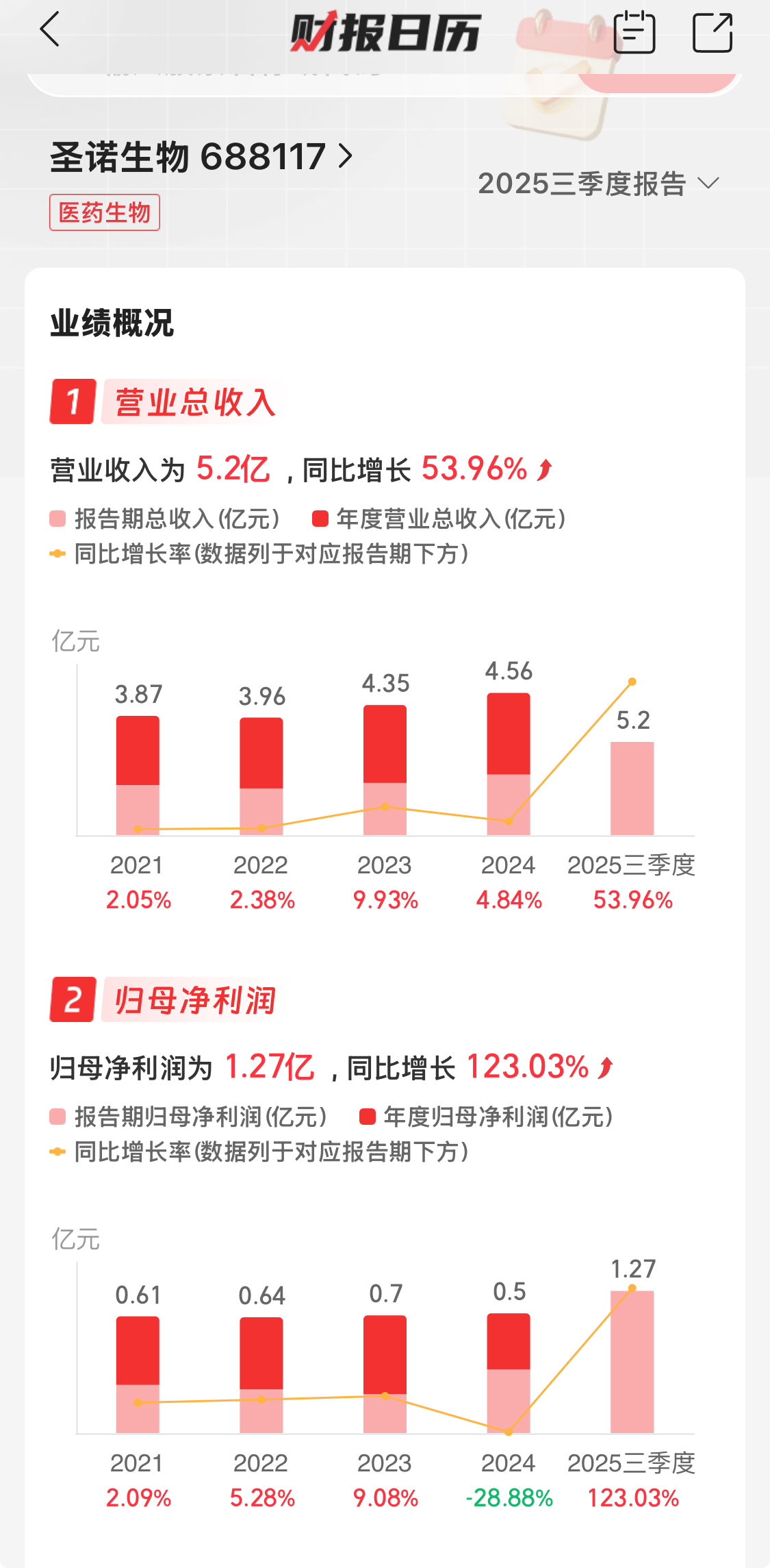圣诺生物2025三季度报告显示,营业总收入同比增长53.96%,归母净利润同比增长123.03%。