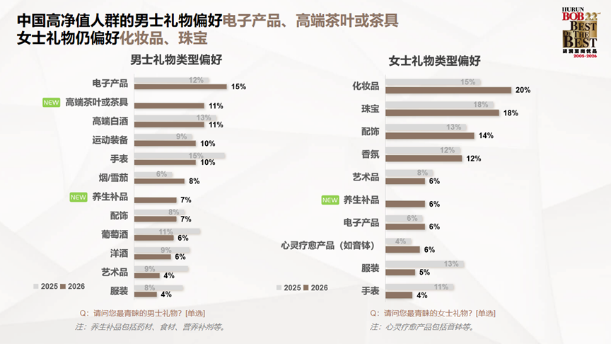 男士礼物首选不再是手表、高端白酒,而是电子产品;女士礼物中化妆品稳居第一,养生补品跻身前十。