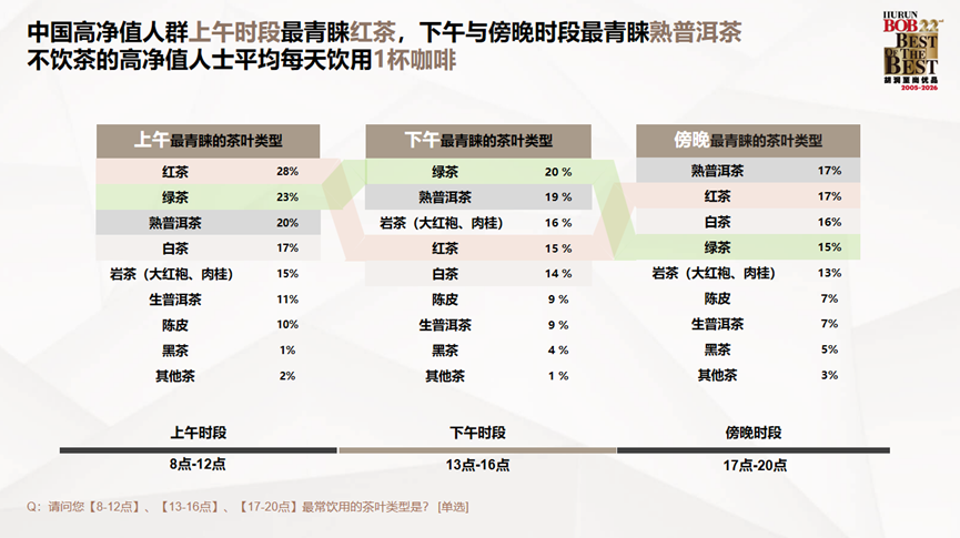 报告显示,高净值人群平均每天睡眠6.7小时,每周运动2小时以上,登山/徒步、跑步是最青睐的运动方式。每月陪伴家人6.3天。放松方式上,最青睐温泉/SPA/足疗、运动,以及享受独处时光如阅读、冥想。平均每天喝一杯咖啡,上午爱喝红茶,下午更爱绿茶和岩茶,傍晚相对喜爱熟普洱和白茶。
