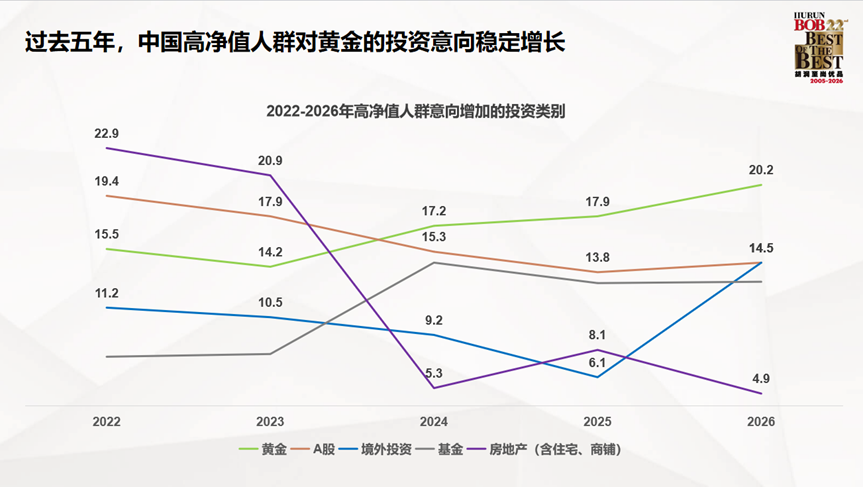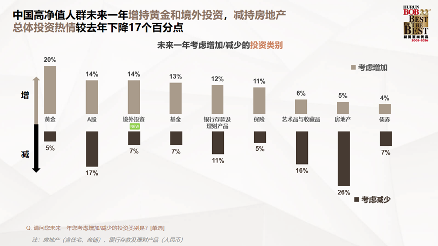 黄金投资的净增长意向达15%,房地产净减少意向为21%。