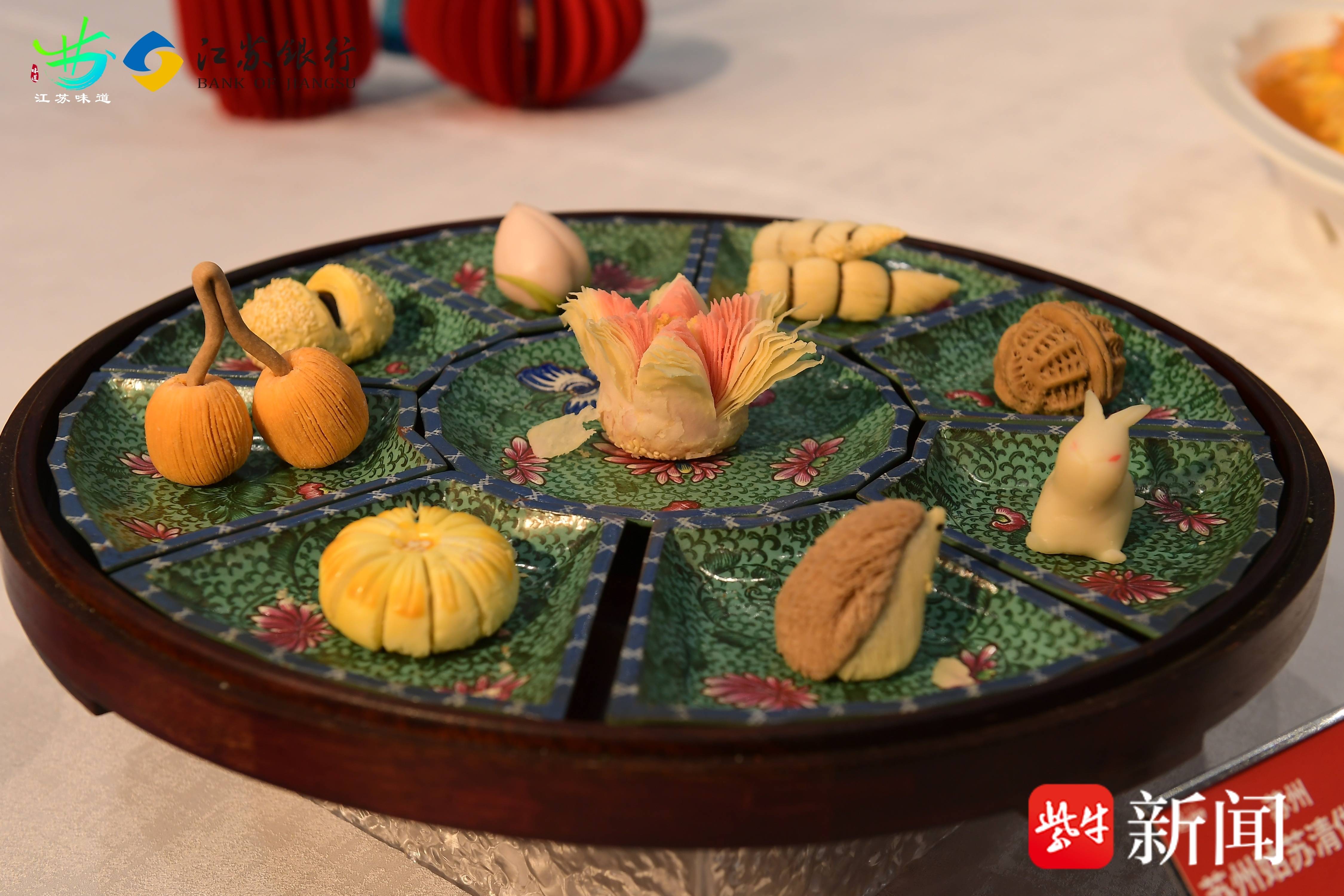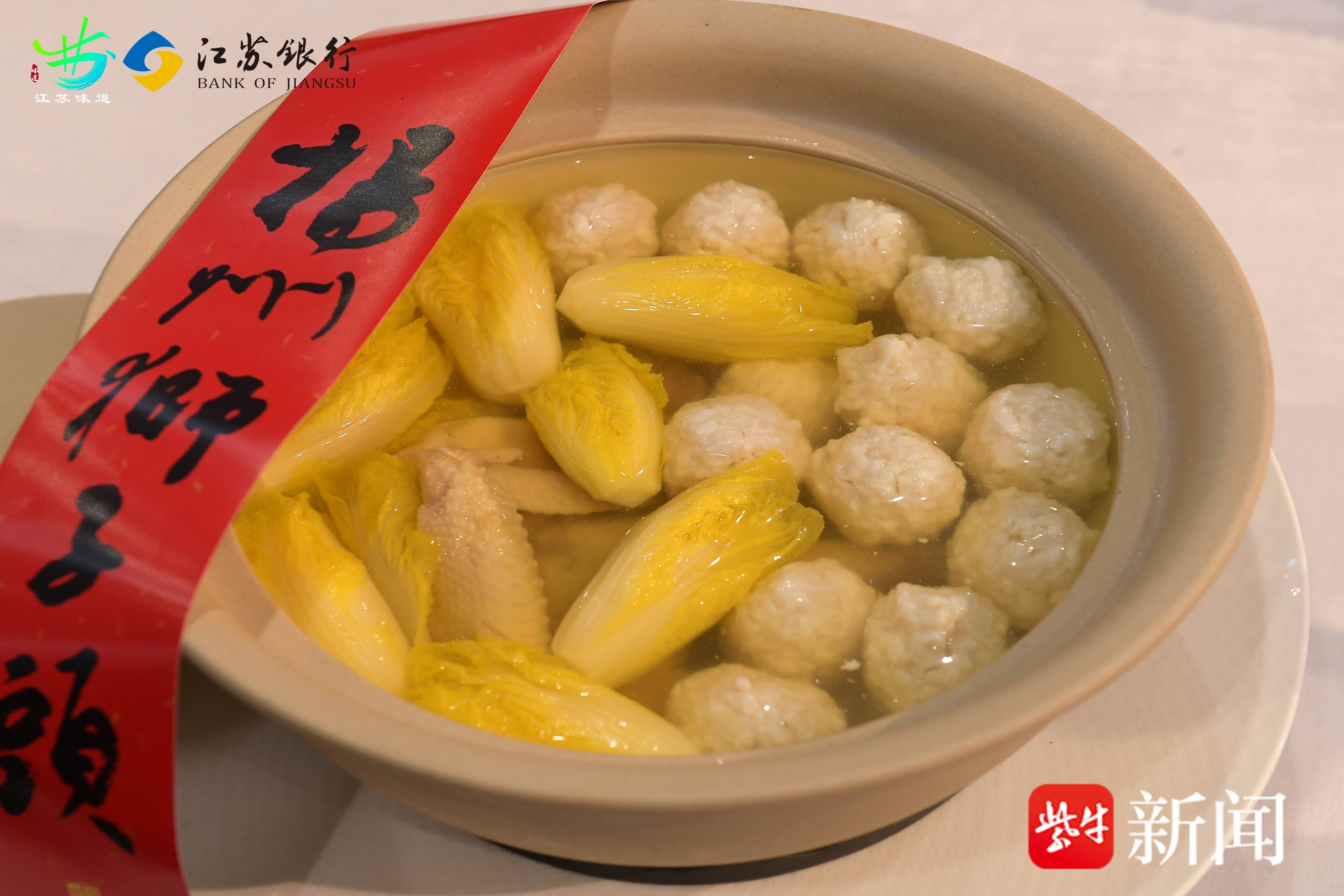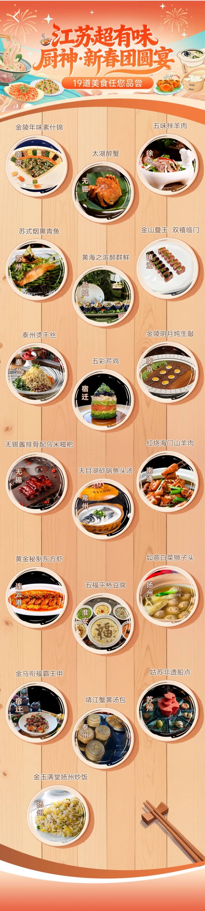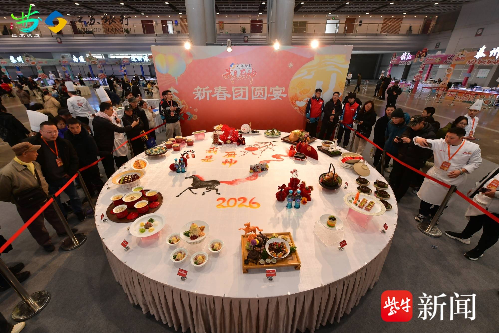 作为整场嘉年华的核心成果,“我是厨神·新春团圆宴”于下午正式发布。记者从江苏省商务厅了解到,该新春团圆宴菜单共有 19 道菜,具体是:凉菜包括金陵年味素什锦(南京)、太湖醉蟹(无锡)、五味拌羊肉(徐州)、苏式烟熏青鱼(苏州)、黃海之滨醉群鲜(盐城)、金山叠玉.双禧临门(镇江)、泰州烫干丝(泰州)、五彩芹鸡(宿迁)。热菜包括金陵明月炖生敲(南京)、无锡酱排骨配乌米糍粑(无锡)、天目湖砂锅鱼头汤(常州)、红烧海门山羊肉(南通)、黄金秘制东方虾(连云港)、如意白菜狮子头(扬州)、金马衔福霸王甲(宿迁)、五福平桥豆腐(淮安)。点心包括姑苏非遗船点(苏州)、点心双拼靖江蟹黄汤包(泰州)。主食为金玉满堂扬州炒饭(扬州)。现场这桌宴席引来大量市民围观,它凝聚了江苏顶尖厨艺,是对江苏千年饮食文化的一次创新性总结与呈现,象征着江苏向八方宾朋发出的“家宴”邀请。