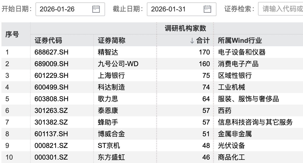 数据显示,1月26日至30日这一周,一级行业中,按机构被调研总次数从高到低排序,电子、机械设备、基础化工、医药生物的关注度较高,其中电子、机械设备的近5天调研机构家数较多。