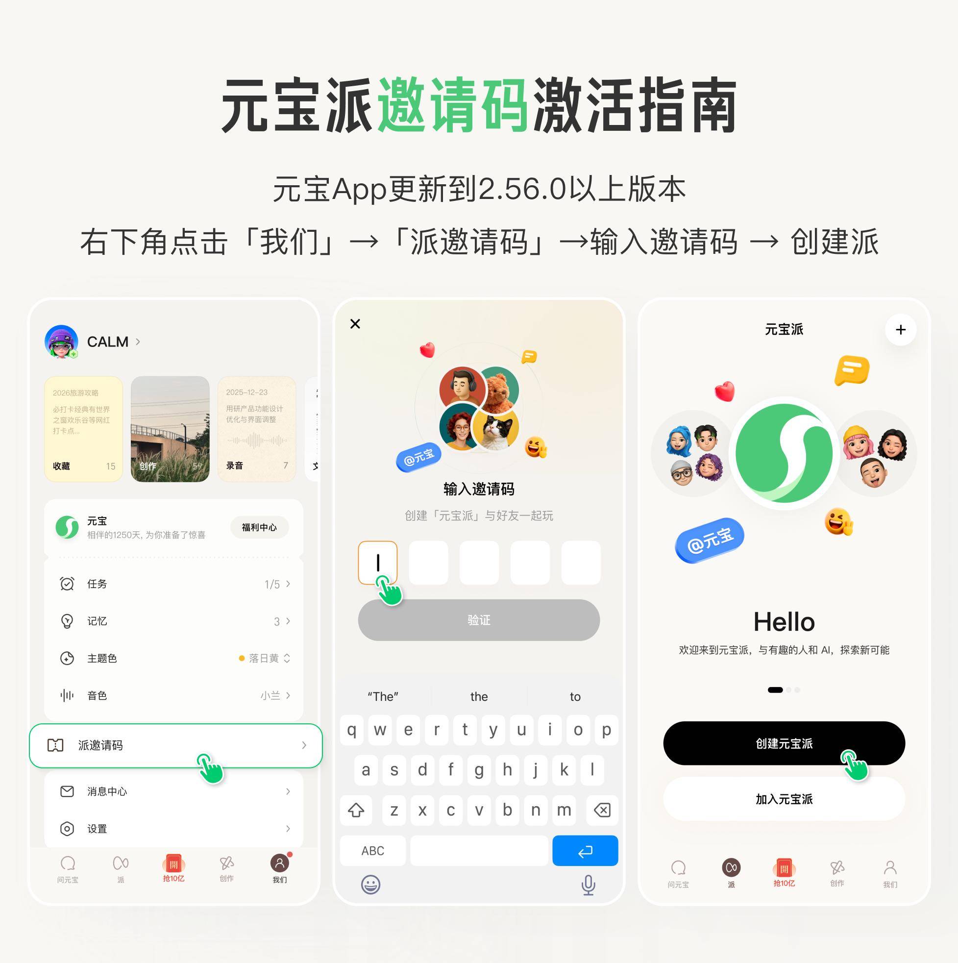 公测期间,将元宝APP更新到2.56.0以上版本,通过元宝APP的「我们」入口,在「派邀请码」里输入邀请码,即可获得创建派的能力。没有获得邀请码的用户,也可以通过朋友分享的派链接和派号加入派。