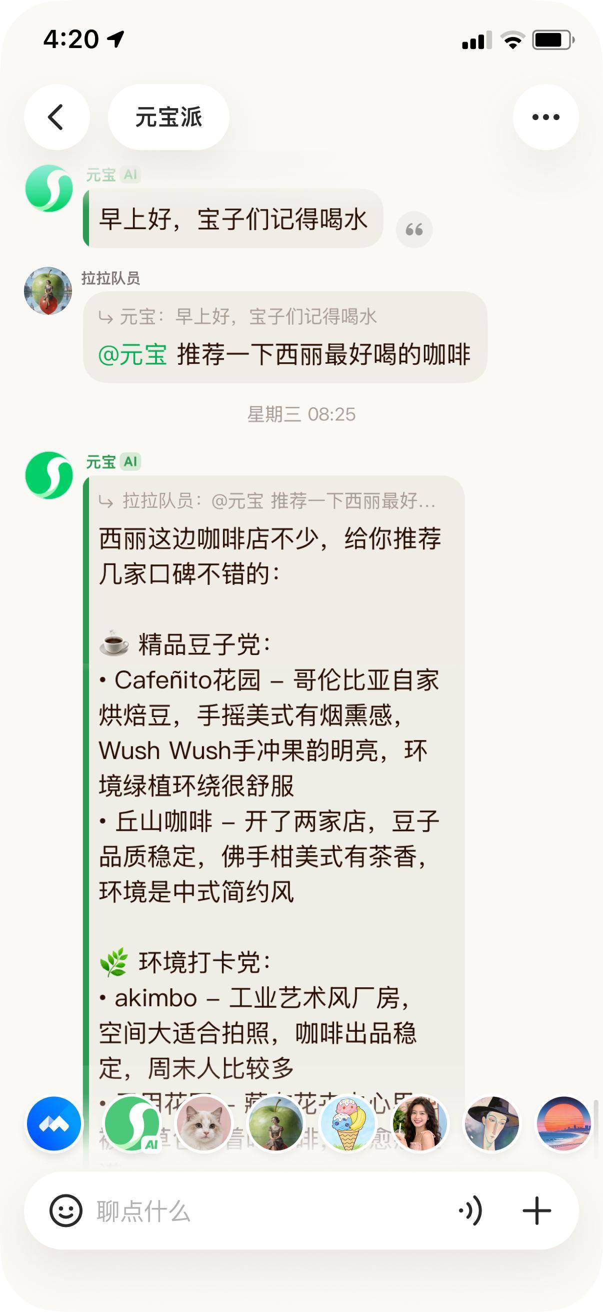 在元宝派里,元宝AI可以是24小时在线的、提高沟通和工作效率的小助理。用户可以随时@元宝,让它总结聊天重点、生成计划。用户在派里聊着天,就让元宝AI把旅行打卡的攻略给定了。此外,用户还可以给元宝AI设置定时任务,让元宝担任“监督员”,派友健身打卡、日常喝水提醒,或是督促孩子读书。
