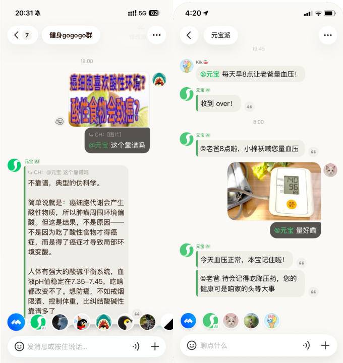 在元宝派里,元宝AI还可以是公正权威的辟谣专家。和长辈沟通中,很多人都会遇到棘手的情况是,长辈对网上谣言深信不疑,子女辟谣往往不管用。而在元宝派中,用户只需@元宝AI,它能作为第三方清晰、客观地帮我们辟谣。不止辟谣,在派里还可以给元宝设置任务,定时提醒爸妈量血压、吃药等等,让元宝成为家庭健康小管家。