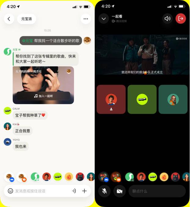 元宝派脱胎于腾讯会议里的AI探索与尝试,接入了腾讯会议行业领先的音视频底层能力。用户在派里,可以@元宝 播放一首歌、或者播放一部电影,也可以通过“一起看”和“一起听”功能入口,让派友们同步观看同一部电影或收听同一首歌曲,实时发表评论和感受。这个沉浸式共享体验,极大地增强了派友之间的连接和互动,让元宝派可以成为同好们的自留地,未来元宝派也有望持续接入、打通腾讯丰富的内容生态。让每个内容体验都成为一次独特的社交体验。