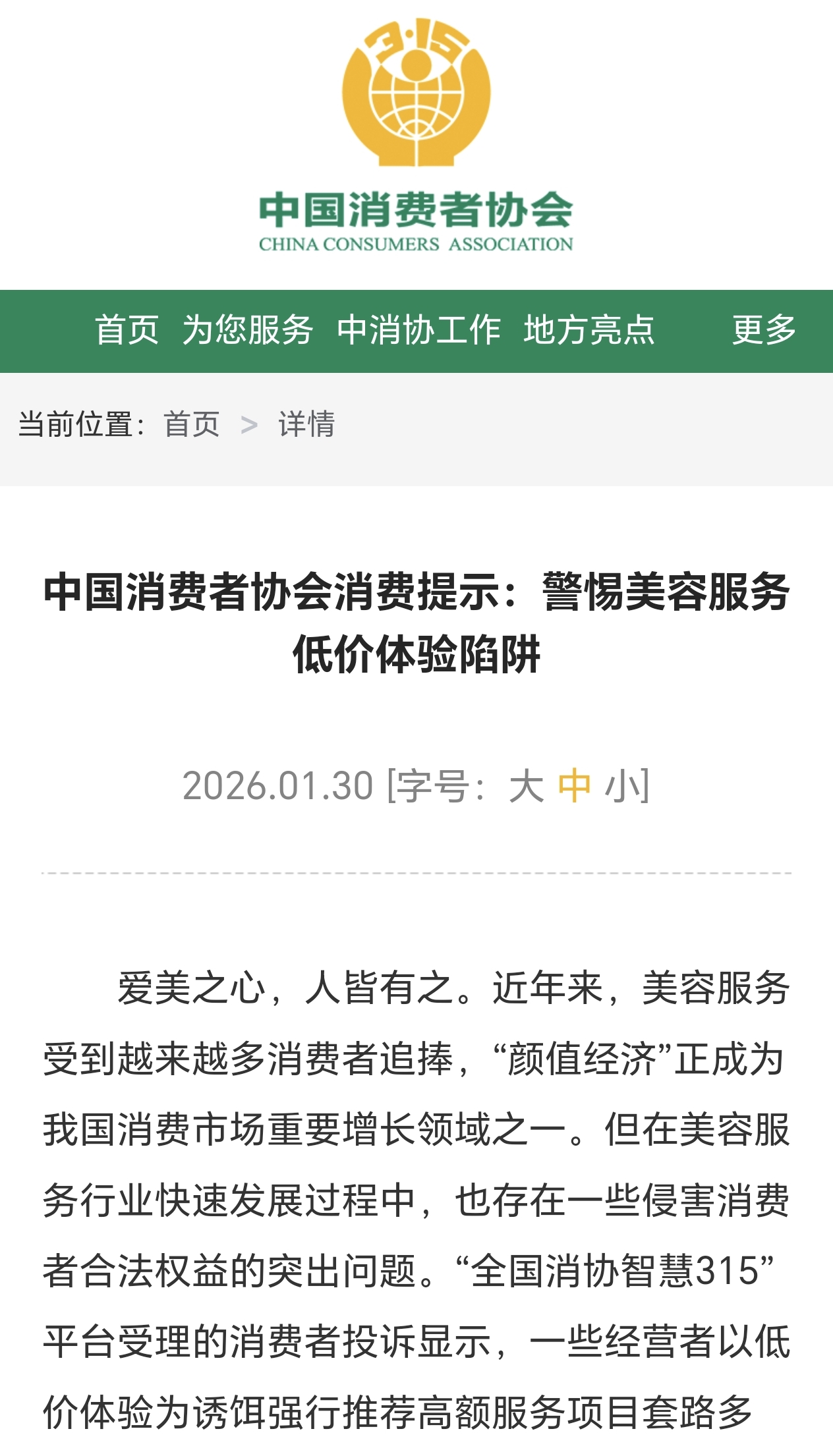 第二点,中消协提醒消费者“增强防范意识,科学理性消费”。防范意识是消费者自我保护的第一道防线。消费者在面对美容服务广告、选择美容服务项目时,要多做“功课”,避免被“忽悠”。一要警惕低价体验陷阱。对各类线上线下的“超低价体验”“免费检测”“免费美容”等营销噱头保持审慎,切勿因贪图便宜而落入高额消费套路。二要保护好个人信息与财产安全。妥善保管个人手机、身份证件、银行卡及支付密码,切勿将手机轻易交由他人操作,谨慎开通并使用“小额免密支付”等功能。三要理性选择美容机构与美容服务项目。美容服务关系到身体健康和生命安全,消费者务必选择正规机构接受美容服务,并结合自身实际和经济状况理性选择美容服务项目。在消费前,要核实确认机构经营资质、人员资质、收费标准等情况,仔细查阅服务协议内容,做到知情选择。特别是选择医疗美容服务的,要确认美容机构是否取得《医疗机构执业许可证》或诊所备案凭证,从事医疗美容服务的医师、护士等是否符合《医疗美容服务管理办法》等规定。