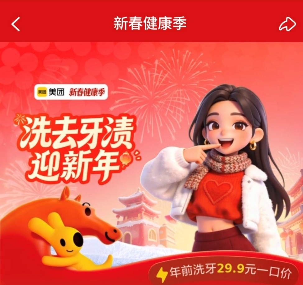 为响应节前用户对“明眸亮齿”的健康需求,美团医药健康近期推出“新春健康季”专题活动,并上线多项优惠服务,如年前洗牙一口价29.9元、全飞秒3.0手术封顶价12999元等,助力用户以更健康的姿态迎接新春。
