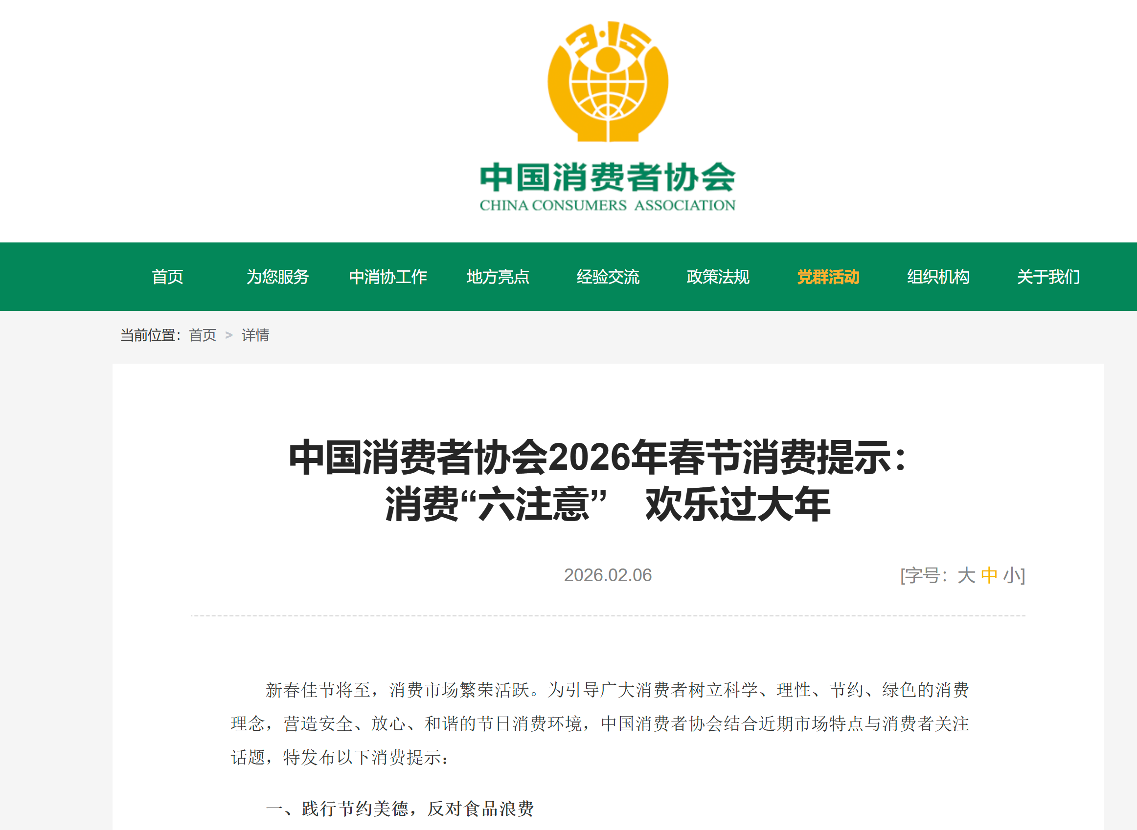 2月6日,中消协发布2026年春节消费提示,提出“六注意”倡议:践行节约美德,反对食品浪费;理性看待保健食品,切勿盲目跟风;关注青少年用眼健康,科学防控近视;选择课外辅导须合规,减轻孩子负担;审慎对待大额预付充值,防范资金风险;崇尚绿色简约消费,抵制过度包装。