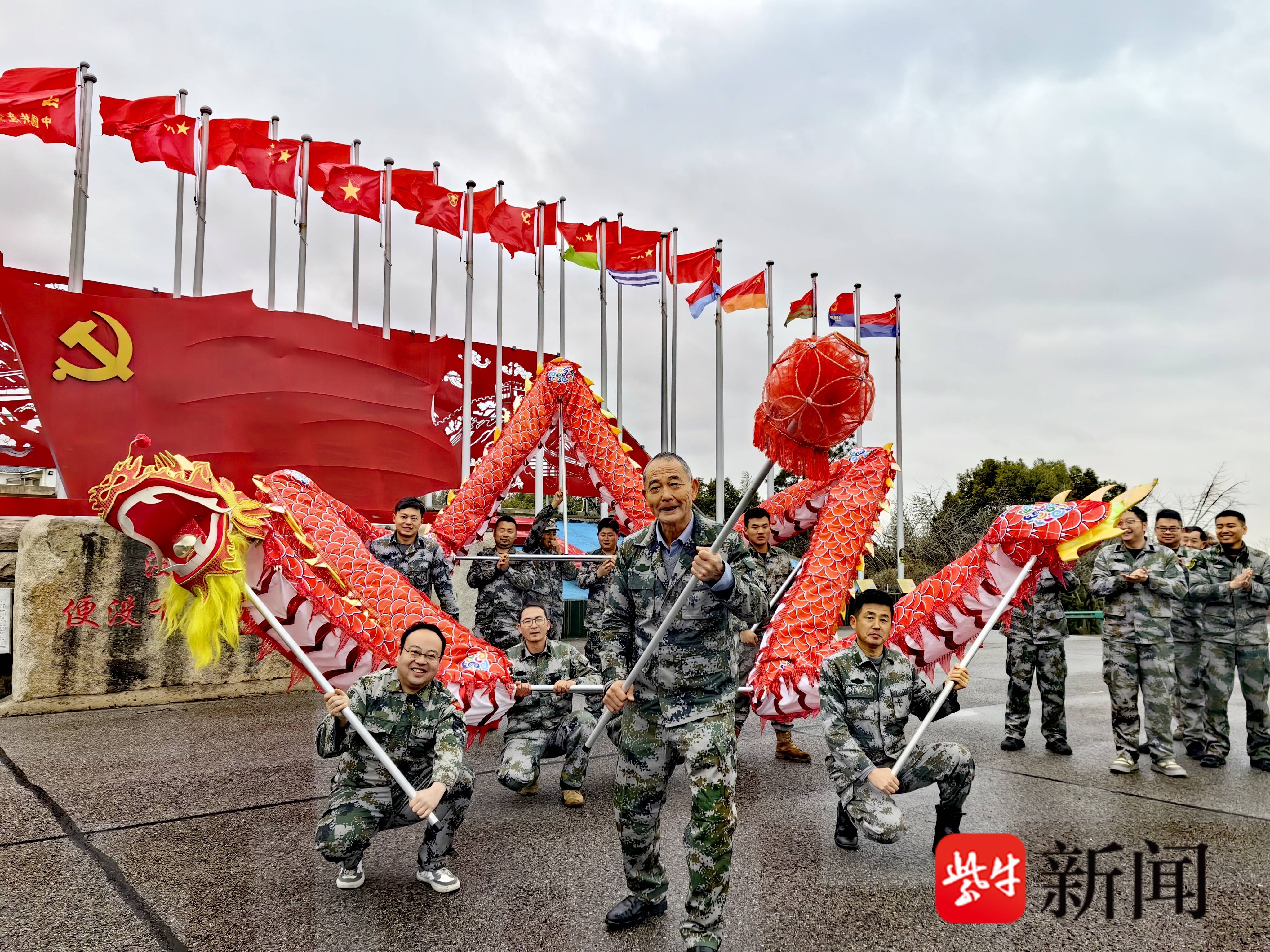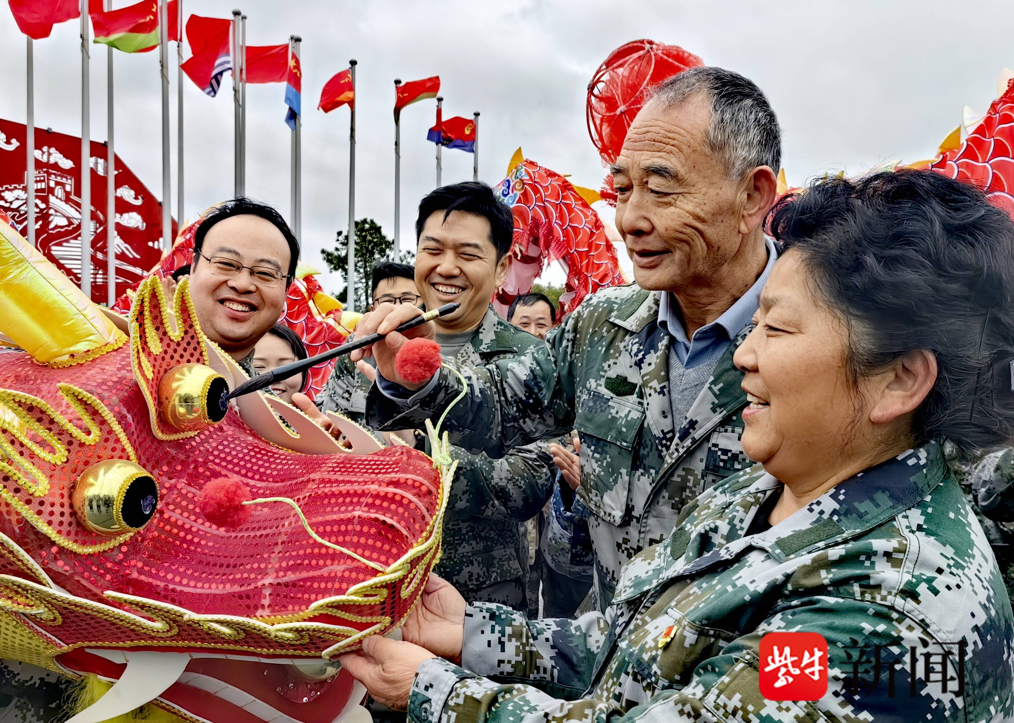 话音未落,身后鼓点骤起——一群身着迷彩服的退役军人正在排练舞龙。金鳞翻腾,龙身蜿蜒如山势起伏。张勇兴致上来,放下毛笔,一把接过龙珠,在队伍最前方奔跑起来,步伐矫健,仿佛又回到了当年抗洪抢险的战场。