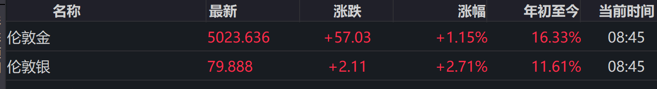 2月9日早盘,黄金白银拉升,截至北京时间8:45左右,现货黄金涨超1%,现报5023.636美元/盎司,重回5000美元关口。现货白银涨近3%,现报79.888美元/盎司。