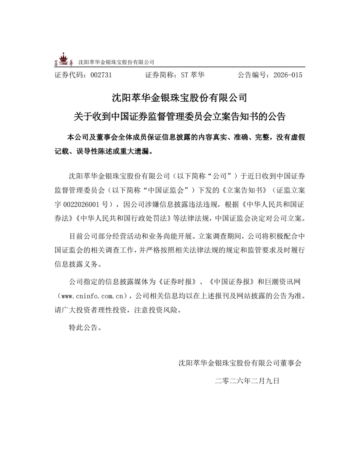 2月9日下午收盘后,萃华珠宝(002731)发布公告称,因涉嫌信披违规被证监会立案调查。2月10日,复牌后的萃华珠宝,证券简称变为“ST萃华”。作为曾经的清皇室制作礼器的“关东珠宝第一店”,萃华珠宝风光不再,股价连续跌停。律师提醒,股民现在可以抓紧提起索赔。