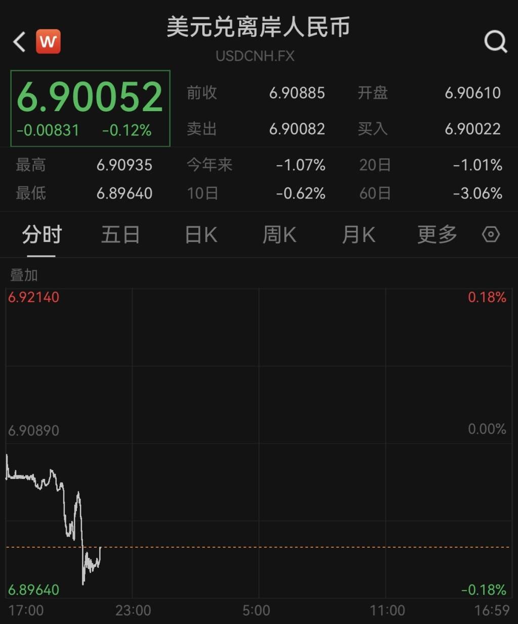 人民币对美元汇率在离岸市场同样升破6.90关口。