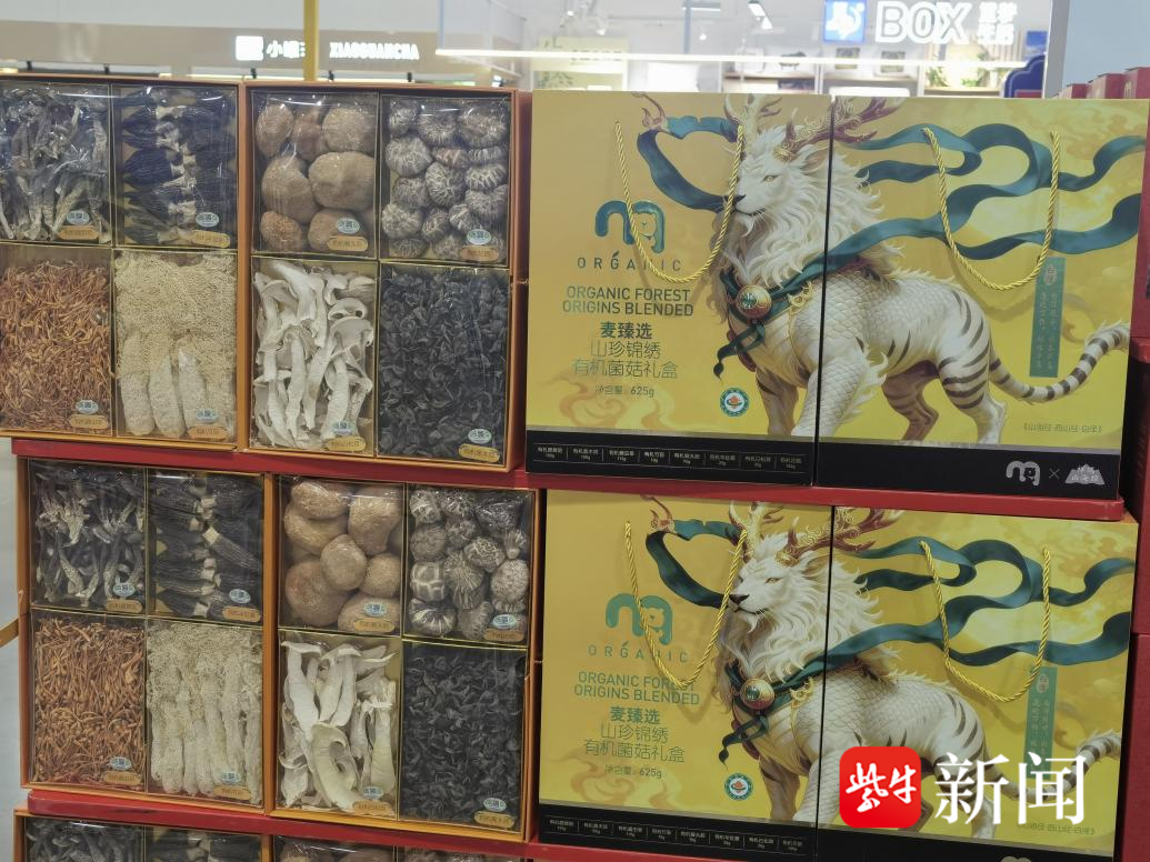 水果零食区的热闹劲儿也一点不输,智利车厘子果肉饱满多汁,是年货清单里的“常客”;麦臻选红颜草莓红得发亮,咬一口甜中带酸,每一款水果都经过仔细筛选,拿在手里就透着放心。零食货架上更是琳琅满目,配料表干净的自有品牌风干牛肉,吃着健康无负担,还有麦德龙与芬兰IP姆明联名的芝士夹心蛋卷、水果软糖、蜜桔果脯,包装可爱,口感清甜,不少年轻人边挑边拍照。礼盒专区里,“祥瑞山海经”系列最吸睛,传统瑞兽的精美设计透着国风韵味,里面装着南北干货和坚果,不管是送亲戚还是送朋友,都体面又实用。
