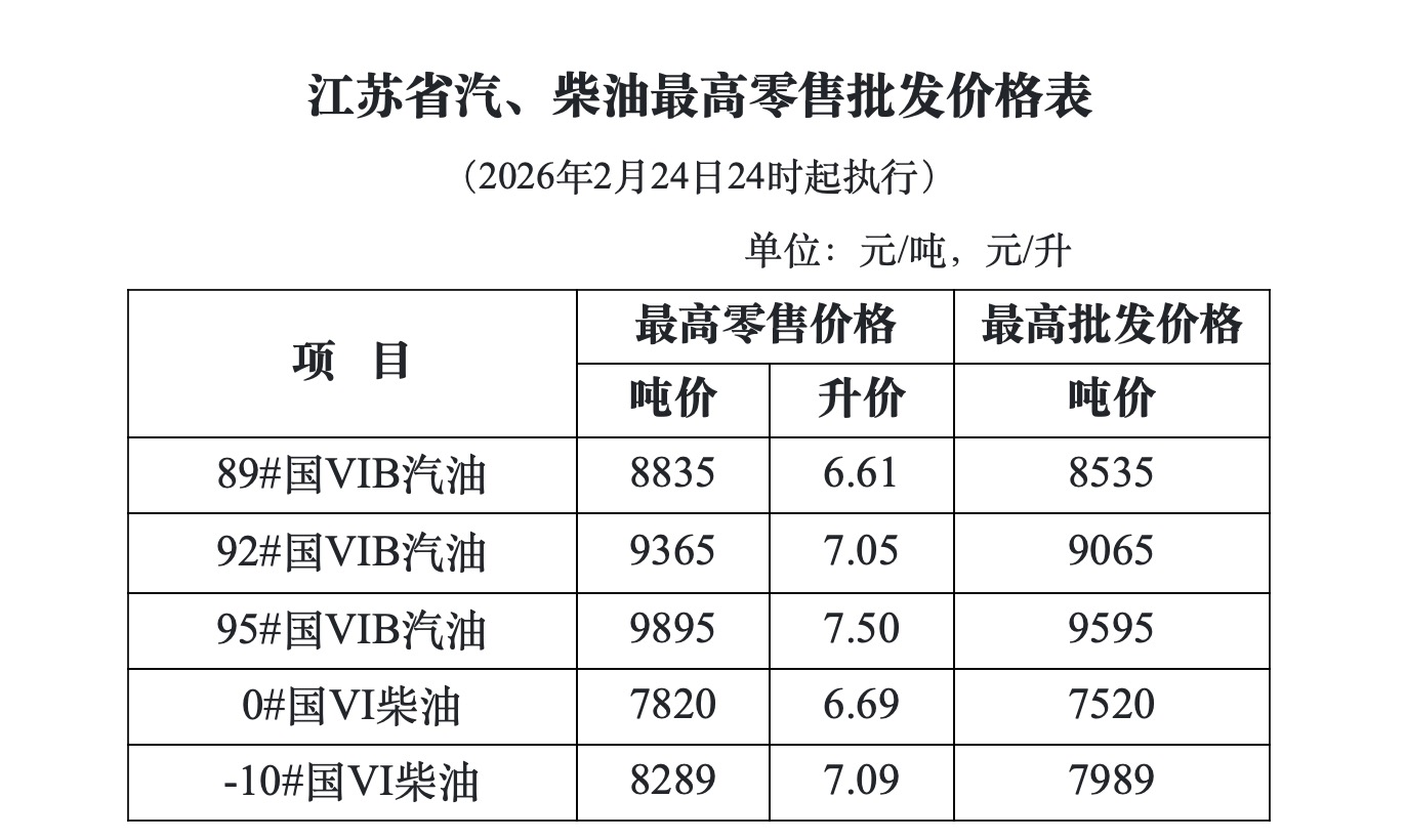 2 月 24日下午 5 点,记者从国家发改委、江苏发改委官网获悉,24日24时,国内汽柴油零售价将分别上调175和170元/吨,折合升价,92 号汽油上调 0.14 元/升。油价上调后,江苏省92号汽油将时隔近四个月重返7元大关。