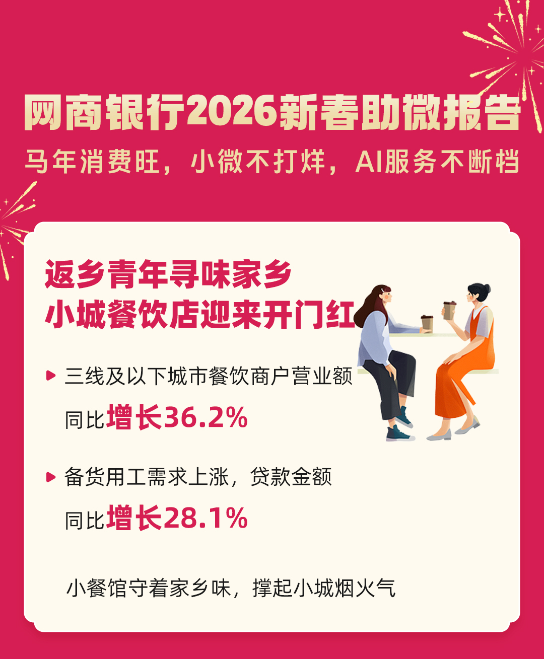 返乡潮激活小城消费活力,餐饮行业率先迎来开门红。网商银行数据显示,受返乡客流带动,三线及以下城市餐饮消费持续火爆,相关商户营业额同比增长 36.2%;同时,客流回归带动备货、用工等需求同步攀升,商户经营性贷款金额同比增长28.1%。一碗家乡热汤,既撑起了浓浓年味,更彰显小城经济的强劲韧性。