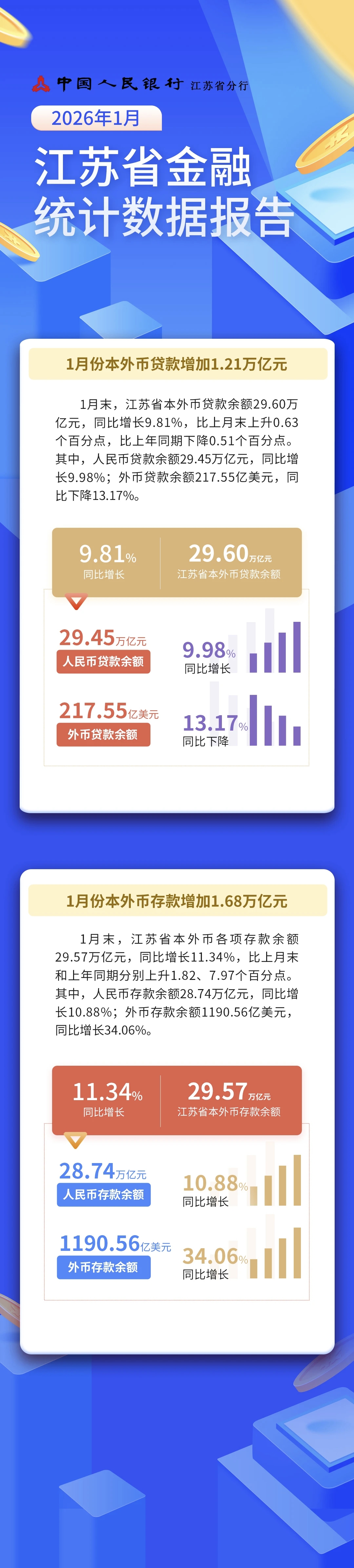 截至1月末,江苏省本外币贷款余额29.60万亿元,同比增长9.81%,比上月末上升0.63个百分点,比上年同期下降0.51个百分点。其中,人民币贷款余额29.45万亿元,同比增9.98%;外币贷款余额217.55亿美元,同比下降13.17%。