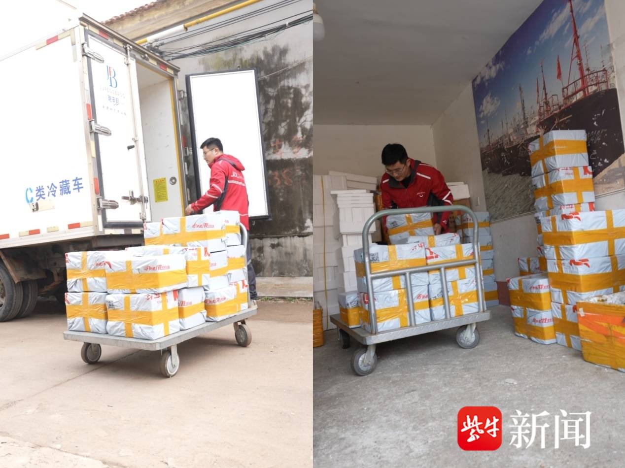 2026年春节前,连云港海头镇的一处海鲜带货直播间异常火热,白色的京东快递面单出个不停,京东小哥徐达动作敏捷,打包、装箱、贴单、发货,一刻也不耽误。