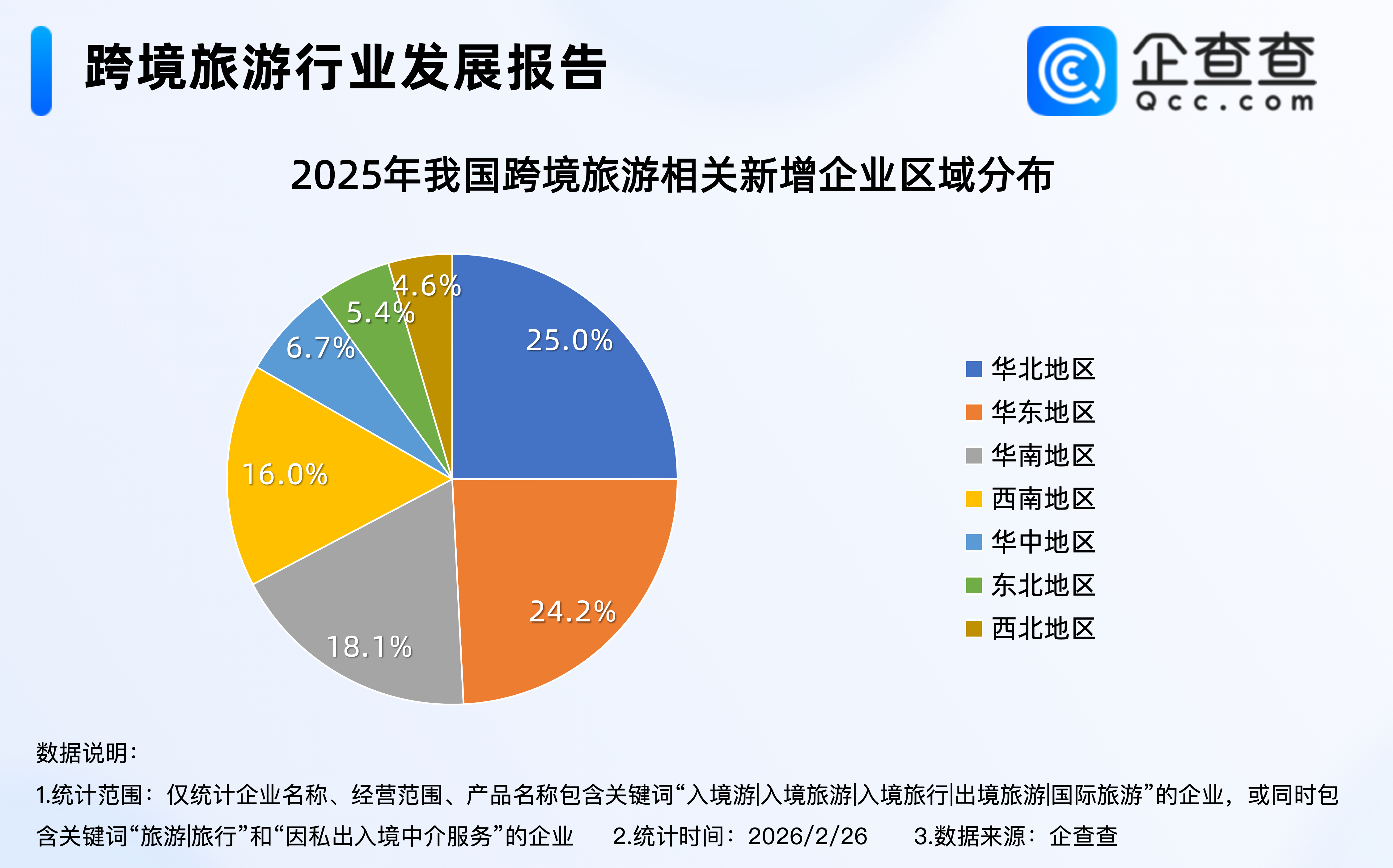 企查查数据显示,截至2月26日,我国现存11.5万家跨境旅游相关企业,区域分布上,华东地区最多,占比26.2%。注册量方面,2021年以来,我国跨境旅游相关企业注册量逐渐稳定在1万家以上,2023—2025年连续三年每年注册量均超1万家。其中2025年全年跨境旅游相关企业注册量达1.25万家;区域分布上,与企业存量区域分布不同的是,2025年注册的1.25万家跨境旅游相关企业中,分布在华北地区的相关企业最多,占比25.0%,其次是华东地区,占比24.2%。