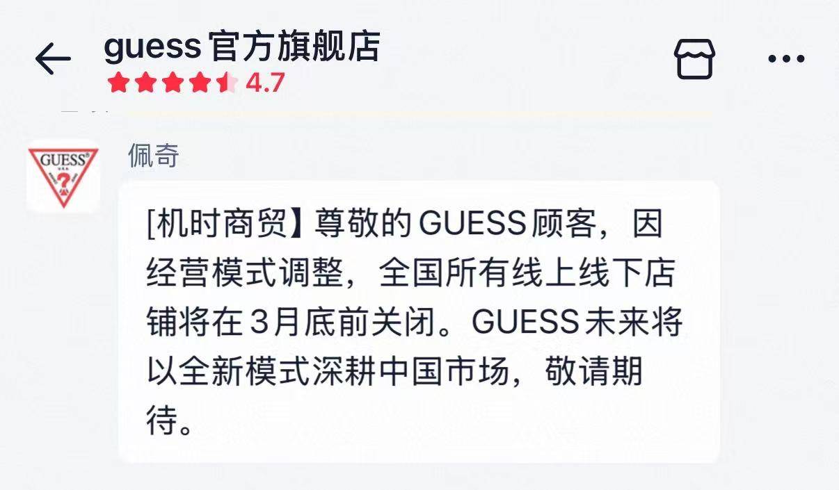 知名时尚品牌GUESS宣布将关闭中国市场所有线上、线下门店,未来将以全新模式深耕