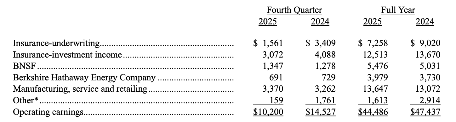 财报显示,伯克希尔2025年营业利润为444.86亿美元,较2024年的474.37亿美元下降约6%;2025年四季度营业利润为102亿美元,同比下滑约30%,这一明显回调主要源于保险承保与“其他”分部的显著回落。