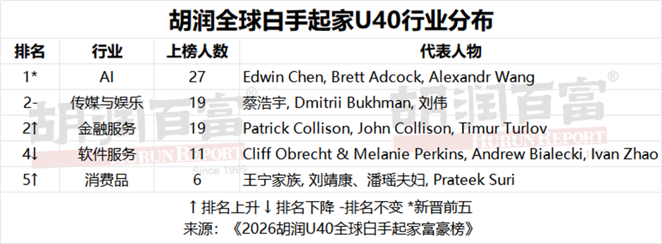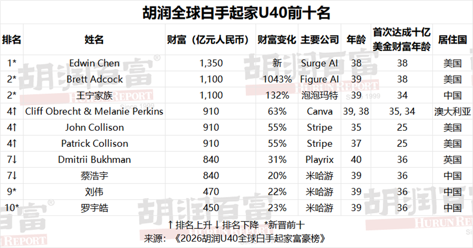 据《2026胡润U40全球白手起家富豪榜》制表