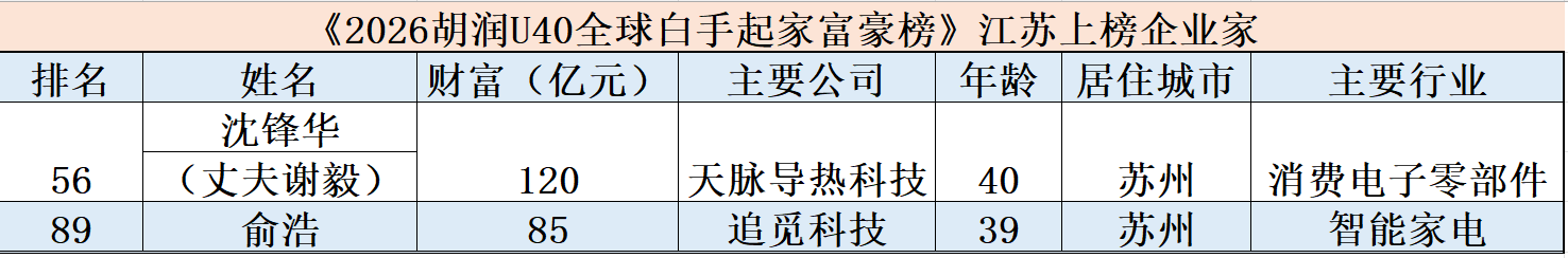 3月10日,《2026胡润U40全球白手起家富豪榜》发布,榜单列出全球40岁及以下白手起家十亿美金企业家。全球108位企业家上榜,创历史新高,较去年增加30位。2位居住在苏州的企业家上榜,一位是天脉导热科技的40岁的沈锋华,她和丈夫谢毅的财富合计为120亿元,谢毅因年龄超过40岁没有上榜;另一位是追觅科技的39岁的俞浩,财富为85亿元。