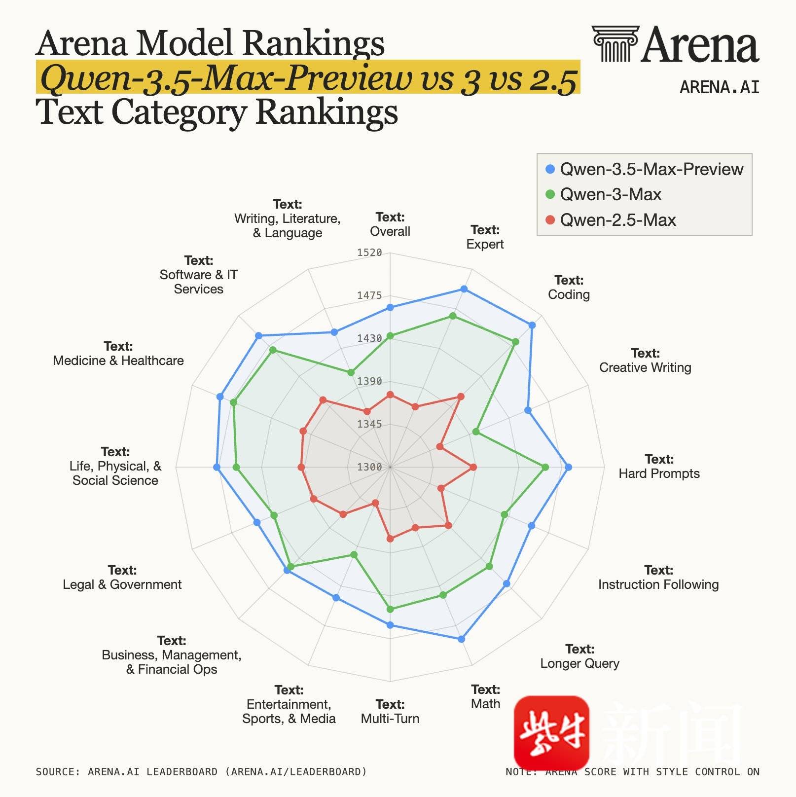 在最新一期LMArena的大模型榜单中,Qwen3.5-Max-Preview旗舰模型预览版惊喜亮相,较上一代千问3模型性能提升明显,并超过了GPT5.4、Claude sonnet-4.6、Grok4.1等顶尖模型,以及其他国产模型:在考验模型绝对胜率(无风格控制)的全球总榜中,Qwen3.5-Max-Preview排名全球第六;在评测模型数学能力子榜单中,排名全球第五、中国第一;在专家级文本能力子榜单中,位列全球第十、中国第一。有消息称,Qwen3.5-Max正式版或将于近期发布,能力还将继续进化升级。