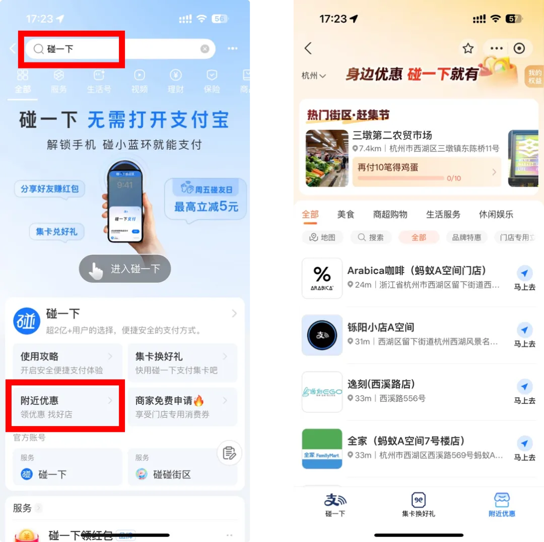 市民在支付宝搜“碰一下”,也可查看附近支持使用的门店信息。