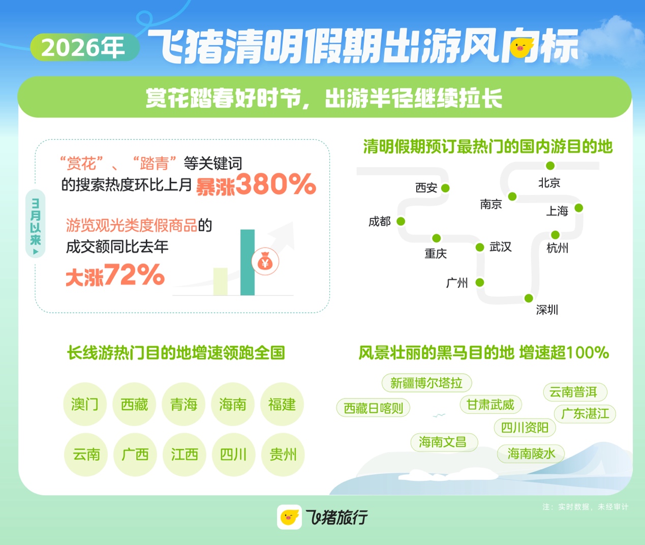 临近清明假期,旅游预订迎来春季高峰。3月26日,飞猪发布《2026清明假期出游风向标》,报告显示,截至目前飞猪清明假期旅游预订量较去年同期强劲增长。其中,国内酒店预订间夜量同比增长约40%,国内景区门票的预订票张数同比增长超70%。