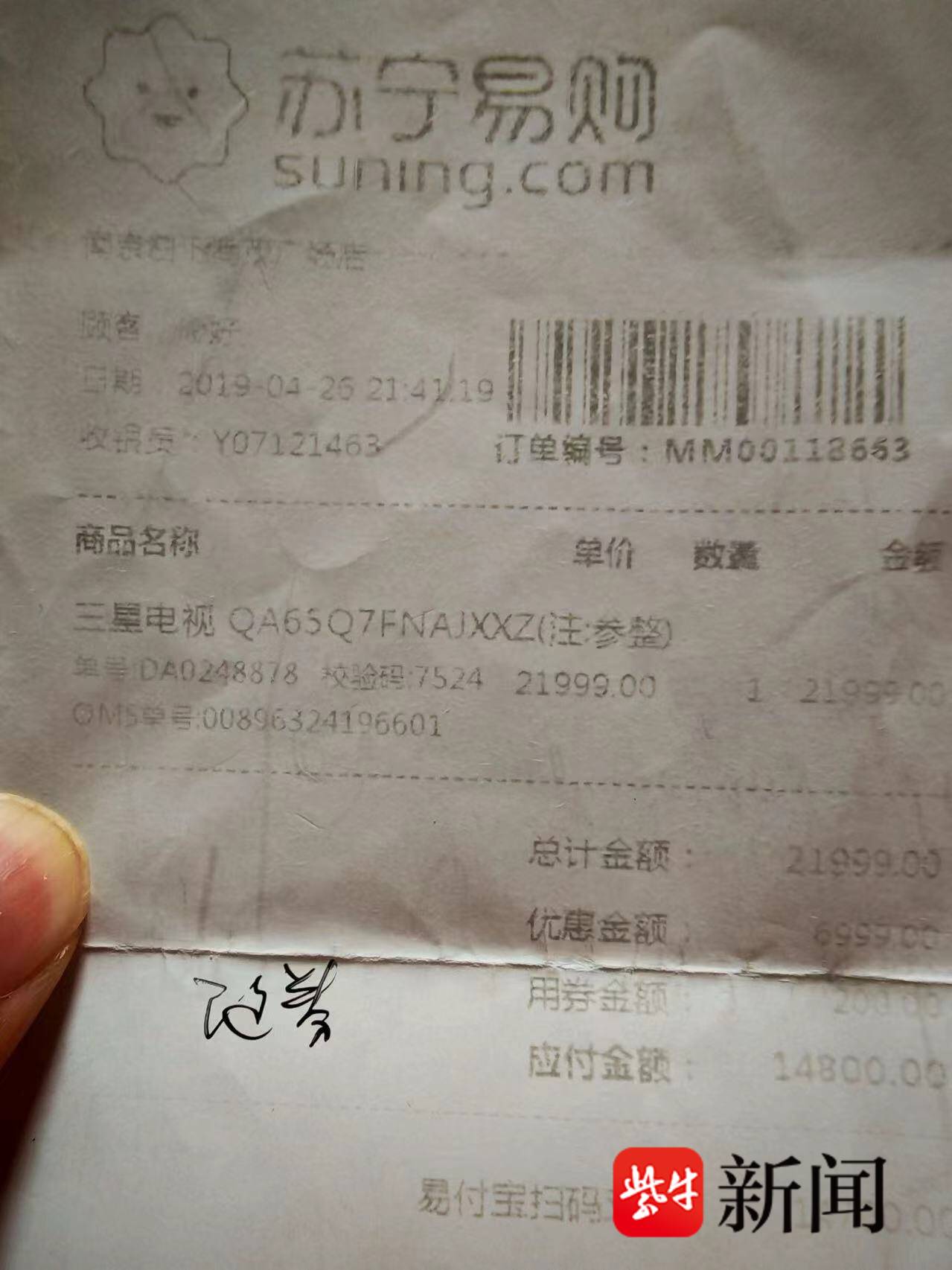 据李先生描述,事情的起因需追溯到2019年4月26日。当时他在苏宁生活广场新街口店购买了一台实付金额为14800元的三星高端QLED电视,并在上门安装时额外支付1300元购买了5年期的延长保修服务。据李先生介绍,当时正值店庆活动,门店销售人员承诺“买5年送2年”。并且销售人员反复强调,若电视在延保期内出现“修不好”的情况,苏宁将履行“以发票购买价全额抵扣换新机”的服务,且消费者可在门店任意挑选机型 。对于消费者而言,这笔千余元的支出买下的是一份长期的心理保障。然而,当初销售人员极力推崇的权益,在几年后的维保环节“走样”了。