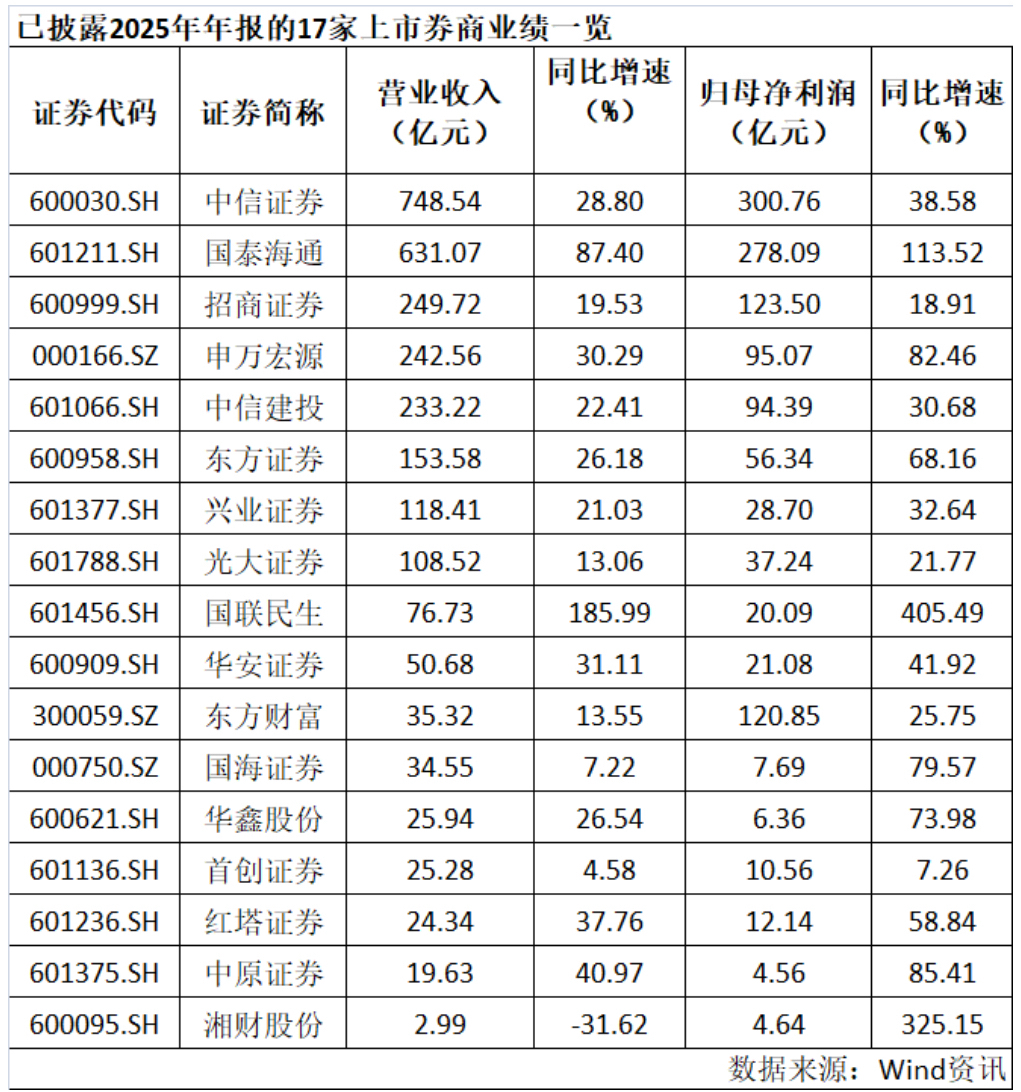 Wind数据显示,截至3月27日晚,十余家上市券商和券商控股公司披露2025年年报。其中,有8家券商2025年营业收入超百亿元,中信证券以748.54亿元居行业首位;净利润方面,中信证券、国泰海通、招商证券、东方财富这4家券商2025年净利润超百亿元,中信证券以300.76亿元居行业首位。
