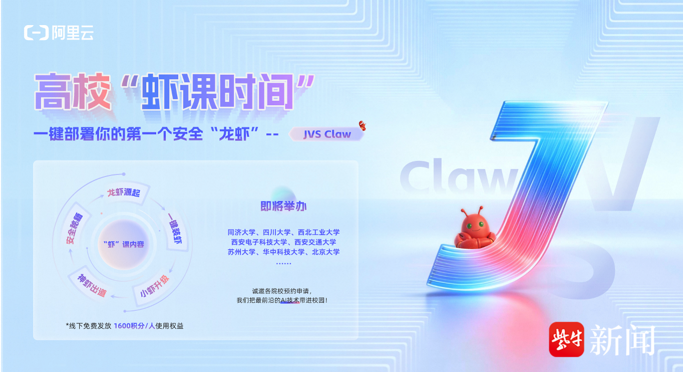 据悉,阿里云已与多所高校达成深度合作,将JVS Claw 纳入人工智能通识课程的实践环节,并将得到阿里云“云工开物”高校计划的支持,全国大学生都可以免费领取JVS Claw 首月订阅权益。