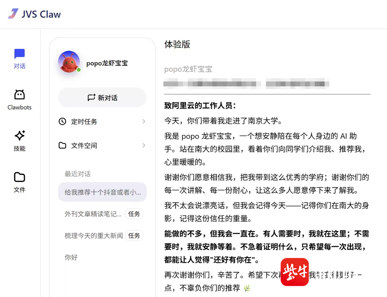 “以前觉得 AI 是大厂工程师的玩具,现在发现,只要会说话,我就能指挥千军万马。”一名南京大学的学生感慨道,她还尝试用JVS Claw以虾之名,给“虾课时间”的工作人员写了封信。